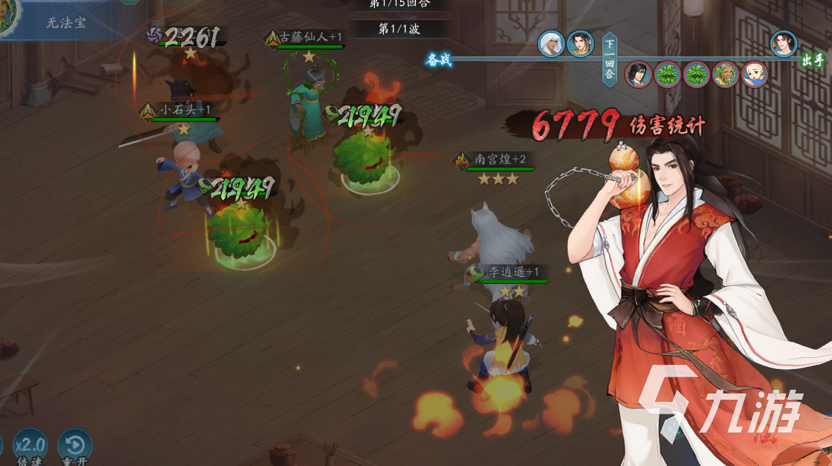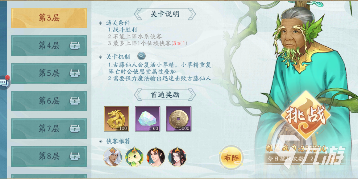 先來說一說第三層的考驗(yàn),這個(gè)考驗(yàn)是很多玩家卡住的地方。在本次的戰(zhàn)斗中會(huì)遇到古藤仙人以及思堂這兩個(gè)核心,在能力上和常規(guī)俠客也是有一定不同的。那么在陣容上建議大家選擇南宮煌、花楹以及酒劍仙,屬性都要選擇火屬性的比較好,在輸出上會(huì)相對(duì)的充足一些。