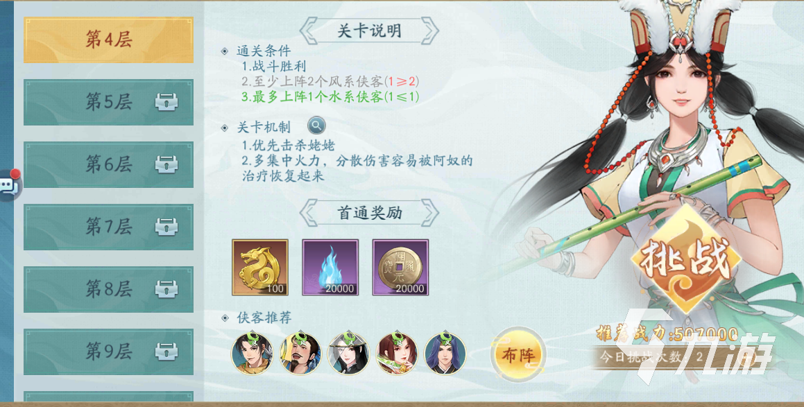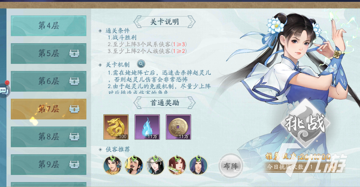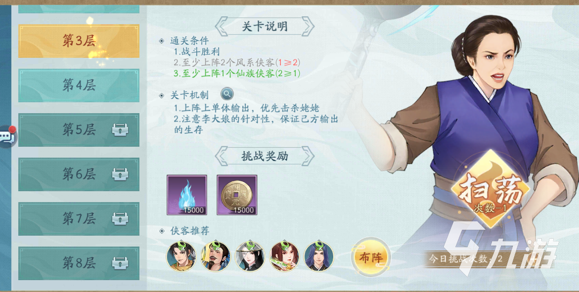 很多玩家在第三層這里卡住了很久,本層的挑戰(zhàn)俠客要有兩個(gè)風(fēng)系的俠客,玩家可以選擇一個(gè)李逍遙在加上一個(gè)風(fēng)系的酒劍仙就可以了。另外種族上要有一個(gè)仙族的俠客,這個(gè)要求還是比較容易的。