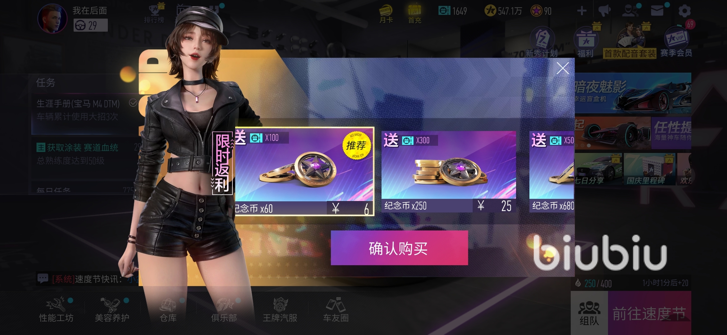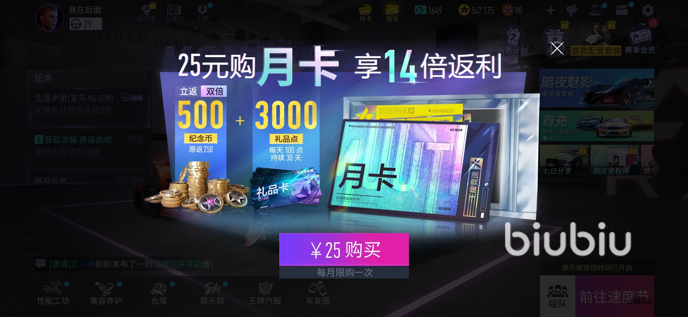 1、使用biubiu加速器加速并打開王牌競速,在首頁的商城、月卡或者禮包中任意點擊一個選項。
