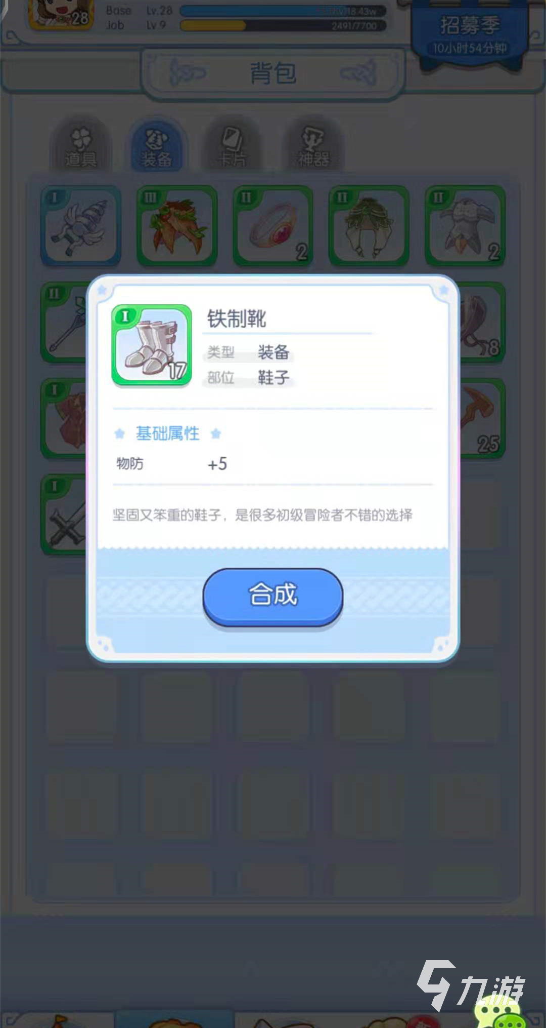 來(lái)吧,跟著小編的節(jié)奏進(jìn)入心力物語(yǔ)游戲主界面,游戲最下面有一排圖形標(biāo)志,分別是城鎮(zhèn),背包,冒險(xiǎn),角色和寵物,道具,裝備,卡片和神器都在背包里面,所以玩家進(jìn)入主界面后就要找到背包點(diǎn)擊進(jìn)去,鞋子是屬于裝備中的一種,所以玩家要進(jìn)入到裝備中找到鐵制靴。