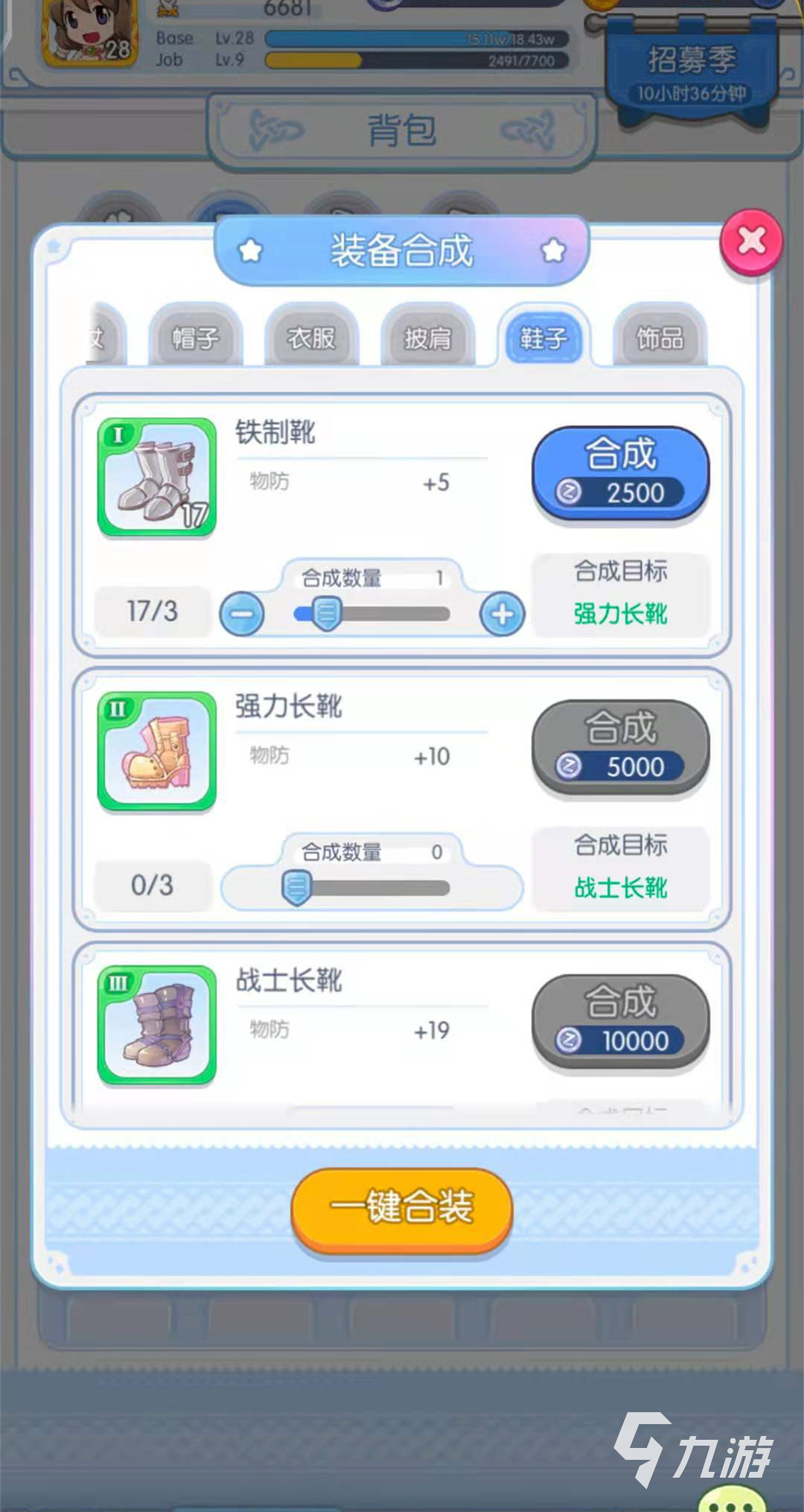 玩家確定合成界面時(shí)就出現(xiàn)玩家擁有鐵制靴的數(shù)量,合成需要兩個(gè)條件,一個(gè)是需要銀幣2500,另一個(gè)是需要3個(gè)鐵制靴才能進(jìn)行一次合成,如果玩家只想合成一次,就要適當(dāng)?shù)恼{(diào)整好合成數(shù)量,鐵制靴合成的目標(biāo)是強(qiáng)力長(zhǎng)靴,玩家確定合成就可以點(diǎn)藍(lán)色框進(jìn)行合成或者點(diǎn)擊黃色框的一鍵合裝進(jìn)行合成。