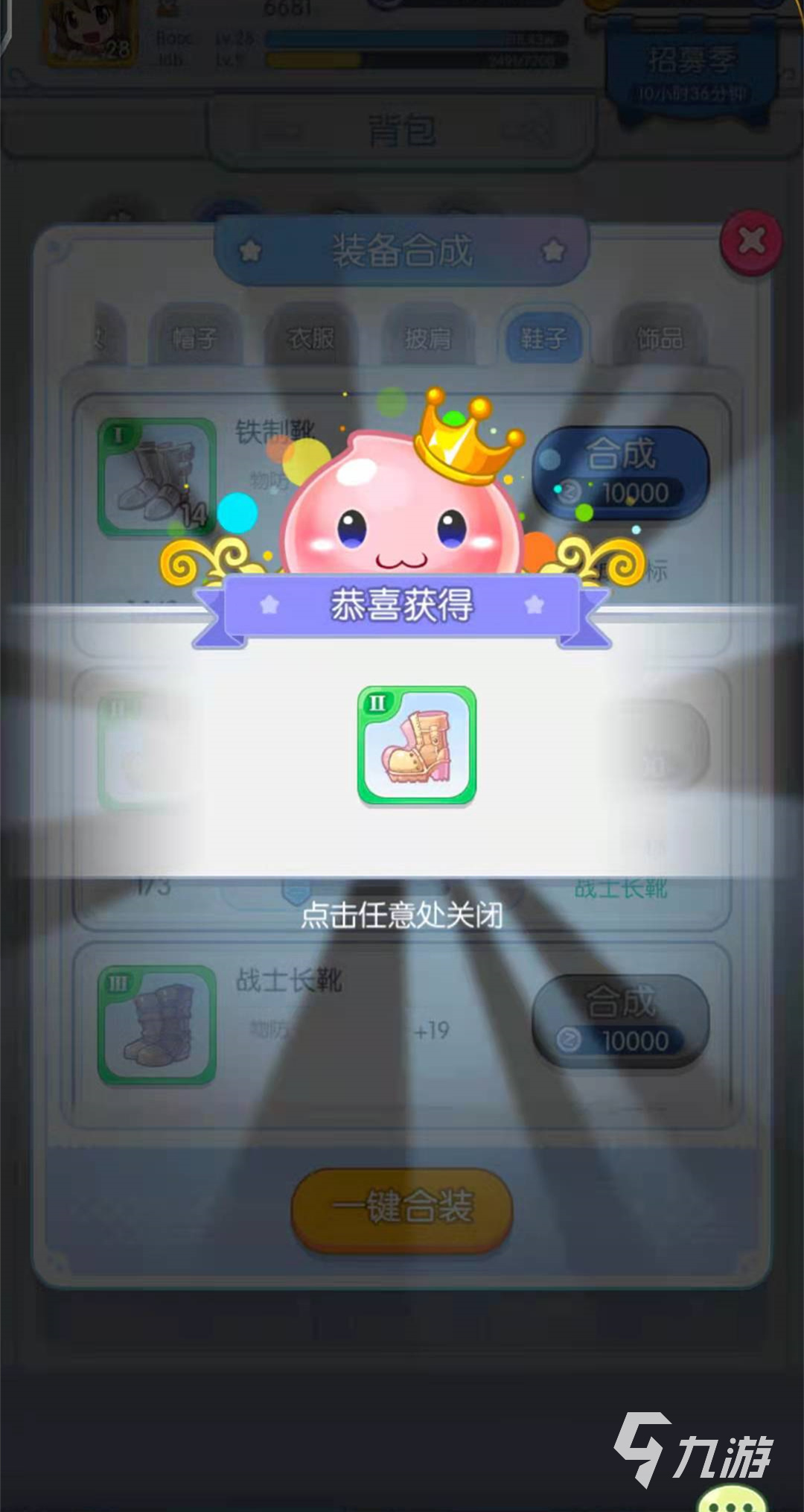 ?鐵制靴合成完畢系統(tǒng)會(huì)主動(dòng)提示玩家恭喜獲得合成后的裝備圖示,鐵制靴合成強(qiáng)力長(zhǎng)靴之后,鞋子的物防值翻了一倍,合成之后物防值為+10,看起來(lái)也是比較高端大氣上檔次的。