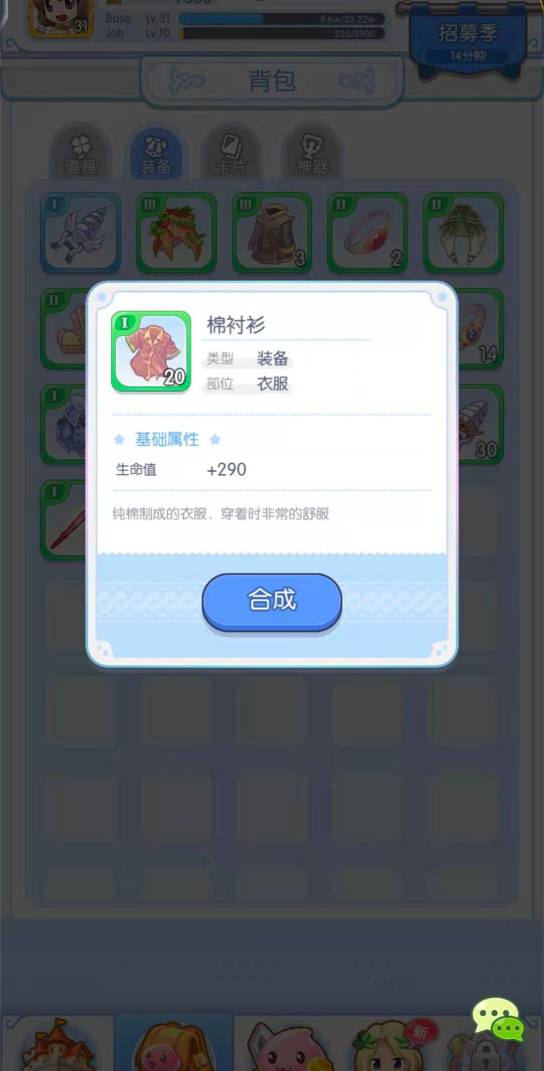 裝備分為5個(gè)等級(jí),從低到高分別為綠級(jí),藍(lán)級(jí),粉級(jí),黃級(jí)和紅級(jí),每種色級(jí)還有一級(jí),二級(jí),三級(jí)幾個(gè)等級(jí),裝備只能一級(jí)一級(jí)的合成不能越級(jí)合成,棉襯衫屬于綠級(jí)中的一級(jí)裝備,只能合成綠級(jí)中的二級(jí)裝備。