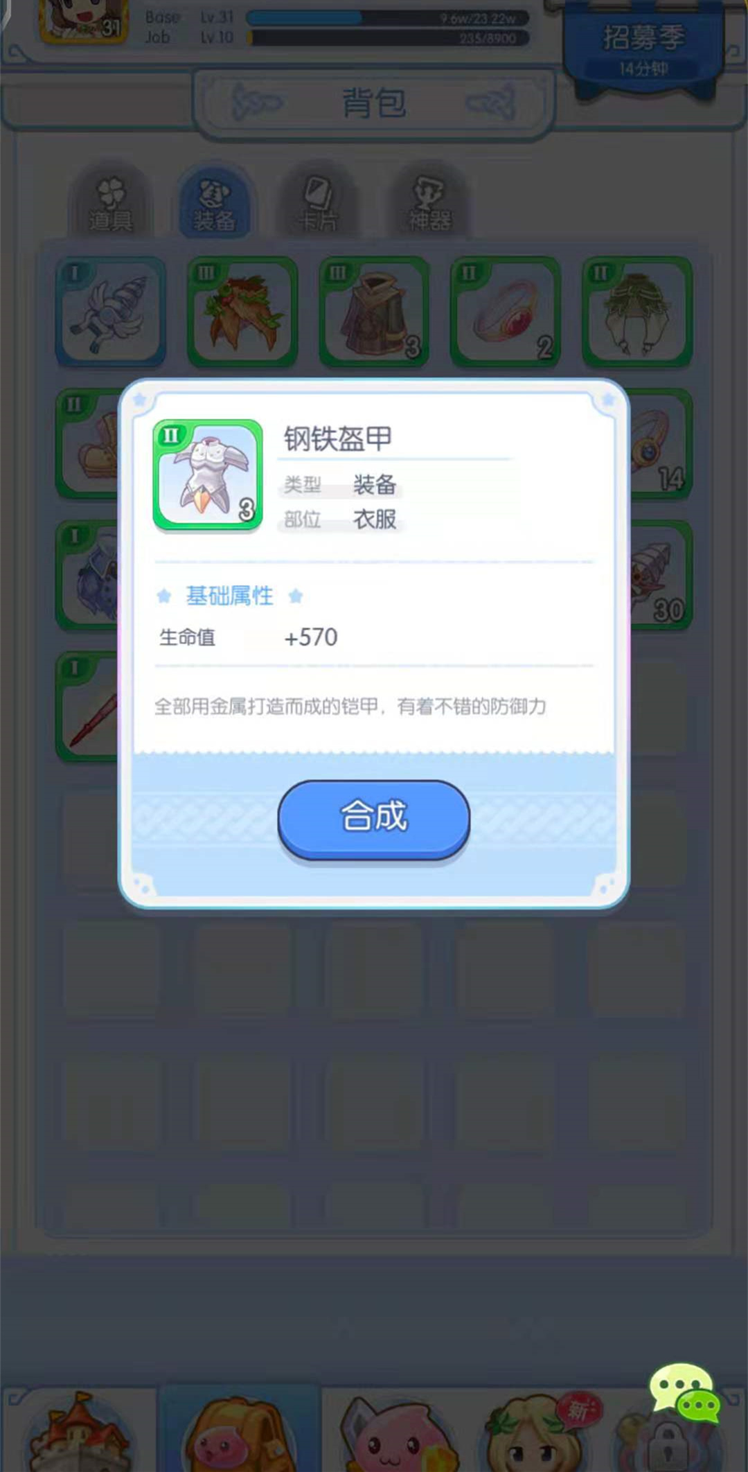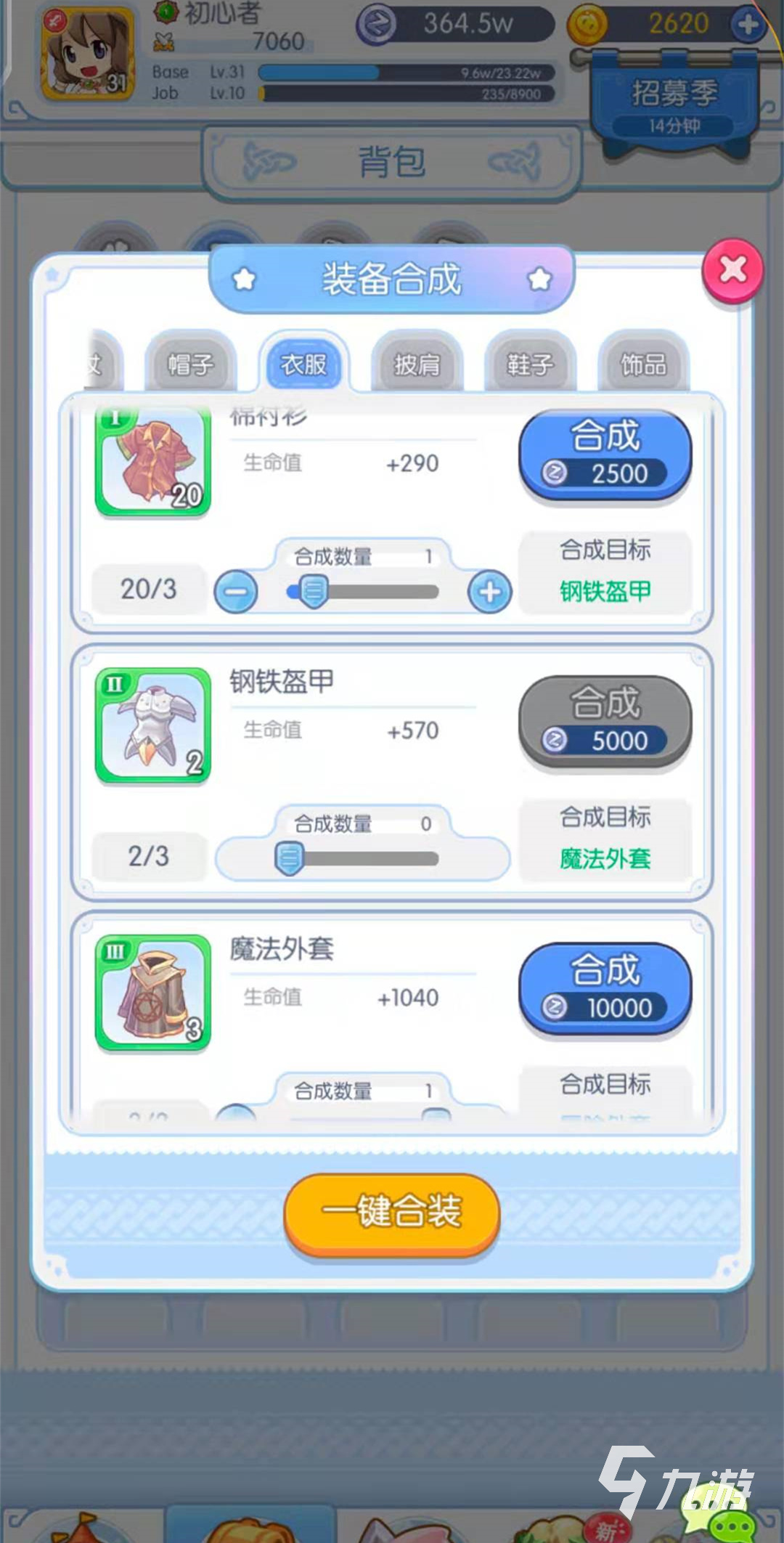每合成一次棉襯衫都需要2500個(gè)游戲銀幣,銀幣只要掛機(jī)就可以獲得,不要將銀幣全部揮霍掉,一定要留一部分進(jìn)行合成,還需要棉襯衫的數(shù)量是3或者是3的倍數(shù),玩家在合成時(shí)一定看清楚合成的數(shù)量,需要合成幾次就適當(dāng)?shù)恼{(diào)整成數(shù)字幾,最后進(jìn)行合成,合成目標(biāo)是鋼鐵盔甲。