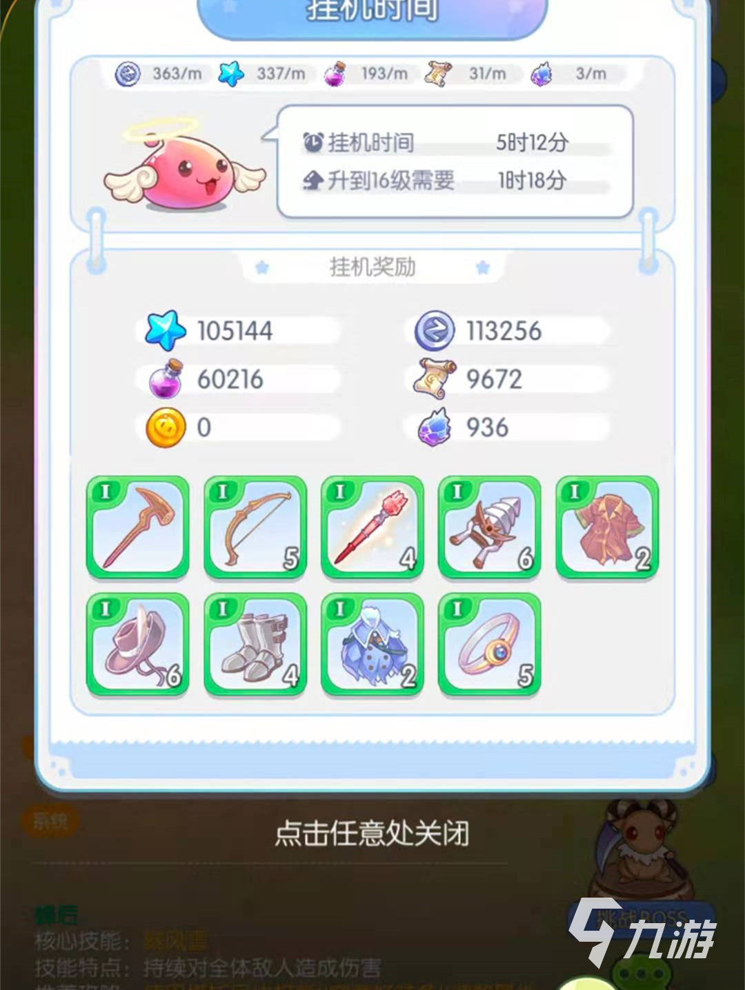 心力物語(yǔ)掛機(jī)獎(jiǎng)勵(lì)中會(huì)有銀幣,掛機(jī)技能經(jīng)驗(yàn),掛機(jī)主角經(jīng)驗(yàn),掛機(jī)伙伴經(jīng)驗(yàn)和魔魂值,還會(huì)有不同種類不同數(shù)量的道具,比如說(shuō)戰(zhàn)甲,戰(zhàn)鞋,魔杖,弓箭,魔戒等等,這些獎(jiǎng)勵(lì)不是一次性發(fā)給玩家的,系統(tǒng)會(huì)每四分鐘發(fā)一次獎(jiǎng)勵(lì),銀幣每次獎(jiǎng)勵(lì)1452個(gè),掛機(jī)主角經(jīng)驗(yàn)每次給1348,掛機(jī)伙伴經(jīng)驗(yàn)每次發(fā)772,掛機(jī)技能經(jīng)驗(yàn)每次發(fā)124,魔魂值每次發(fā)12個(gè)。這些是每4分鐘系統(tǒng)一定會(huì)發(fā)的,道具是不定時(shí)下發(fā)一次的。