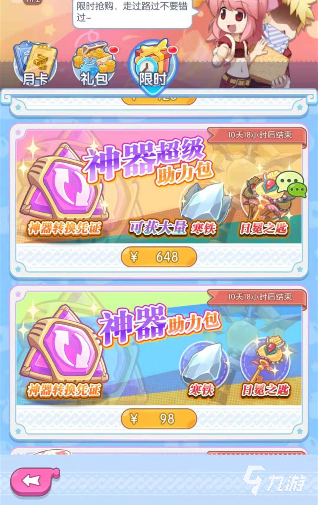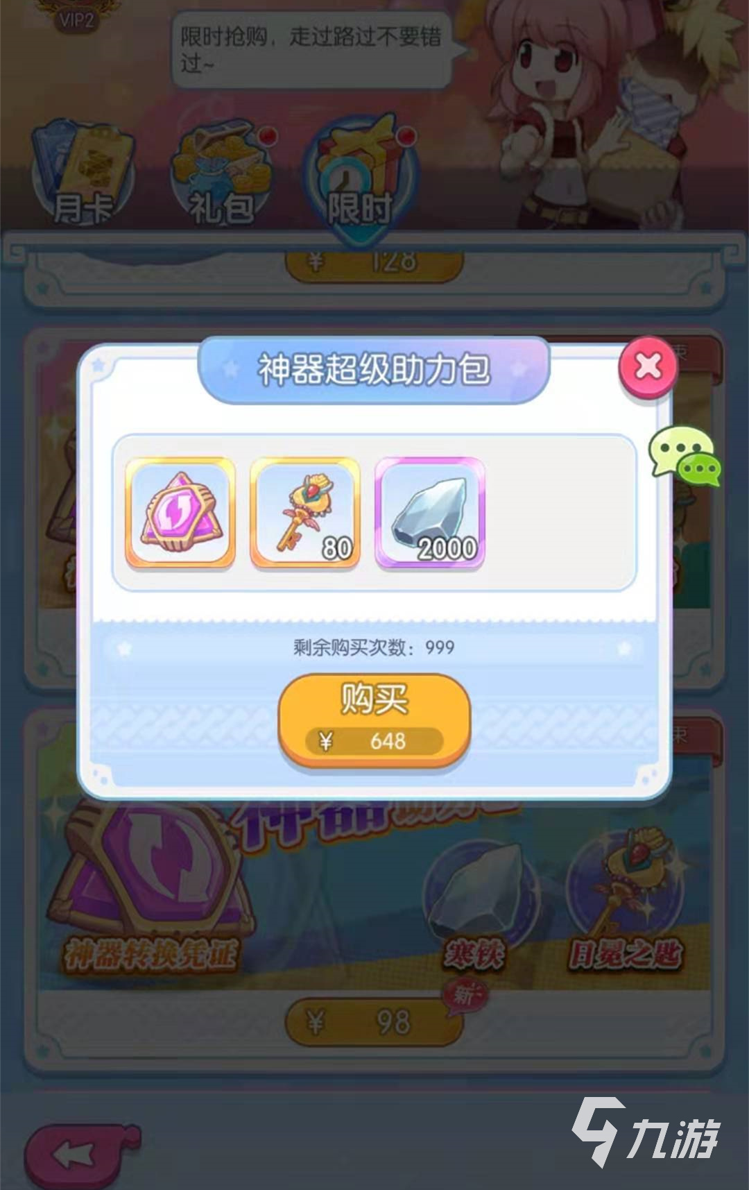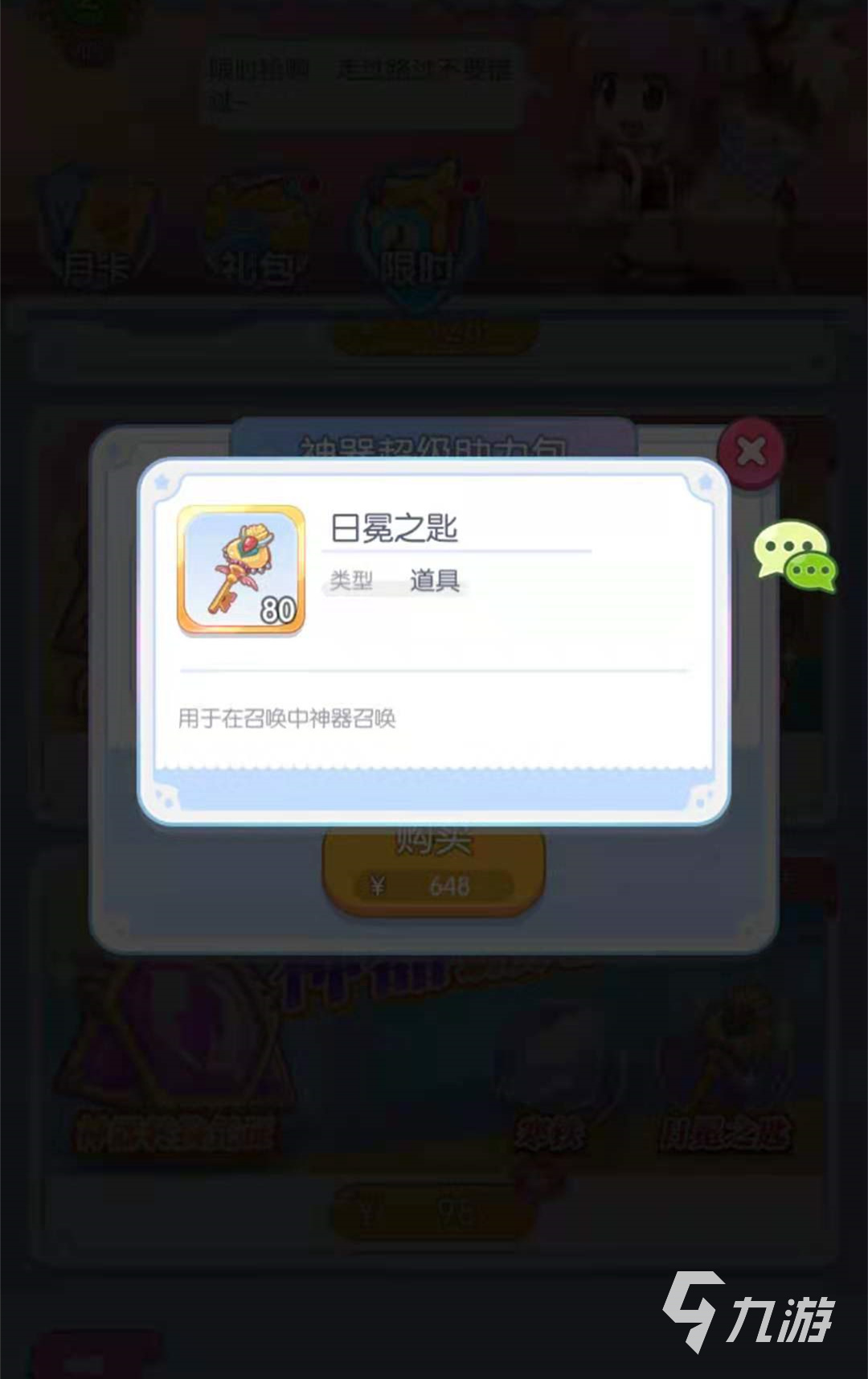玩家可點(diǎn)擊神器助力包和超級(jí)助力包,這兩個(gè)里面都有日冕之匙道具,只不過數(shù)量不同,獲取的方式也非常簡(jiǎn)單明了,要求小伙伴們消費(fèi)648就可以得到1個(gè)神器轉(zhuǎn)換憑證,80個(gè)日冕之匙以及2000個(gè)寒鐵道具,要知道在神器召喚中是少不了日冕之匙的,玩家們可以考慮一下這個(gè)活動(dòng)。