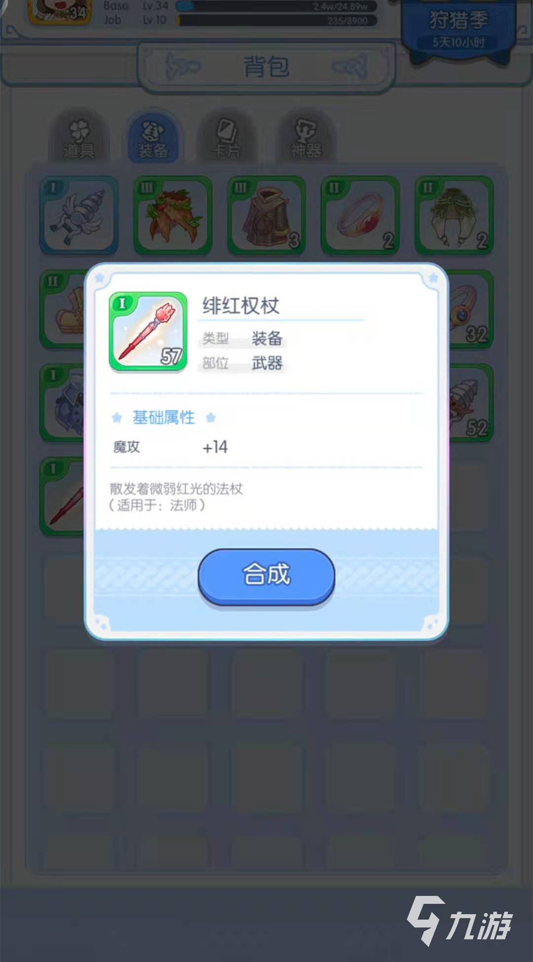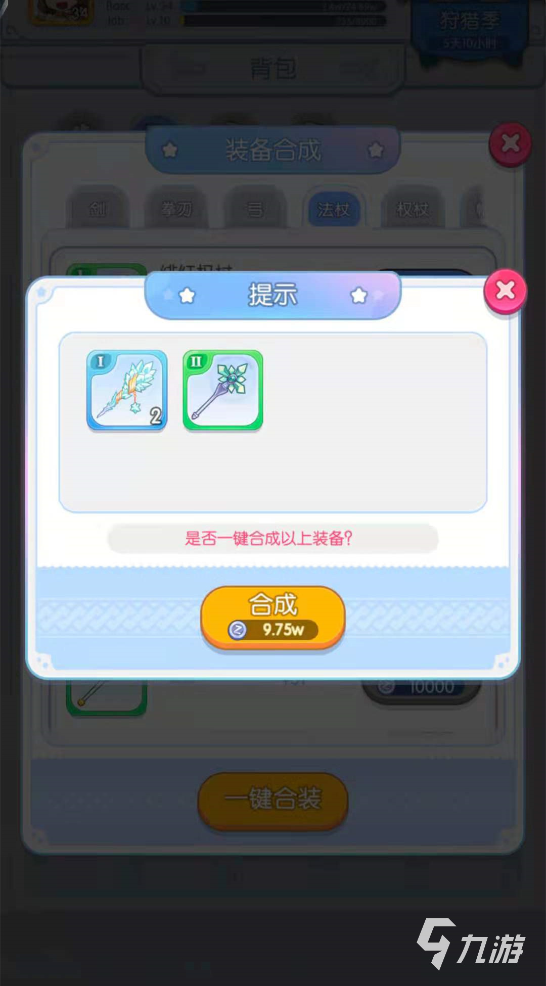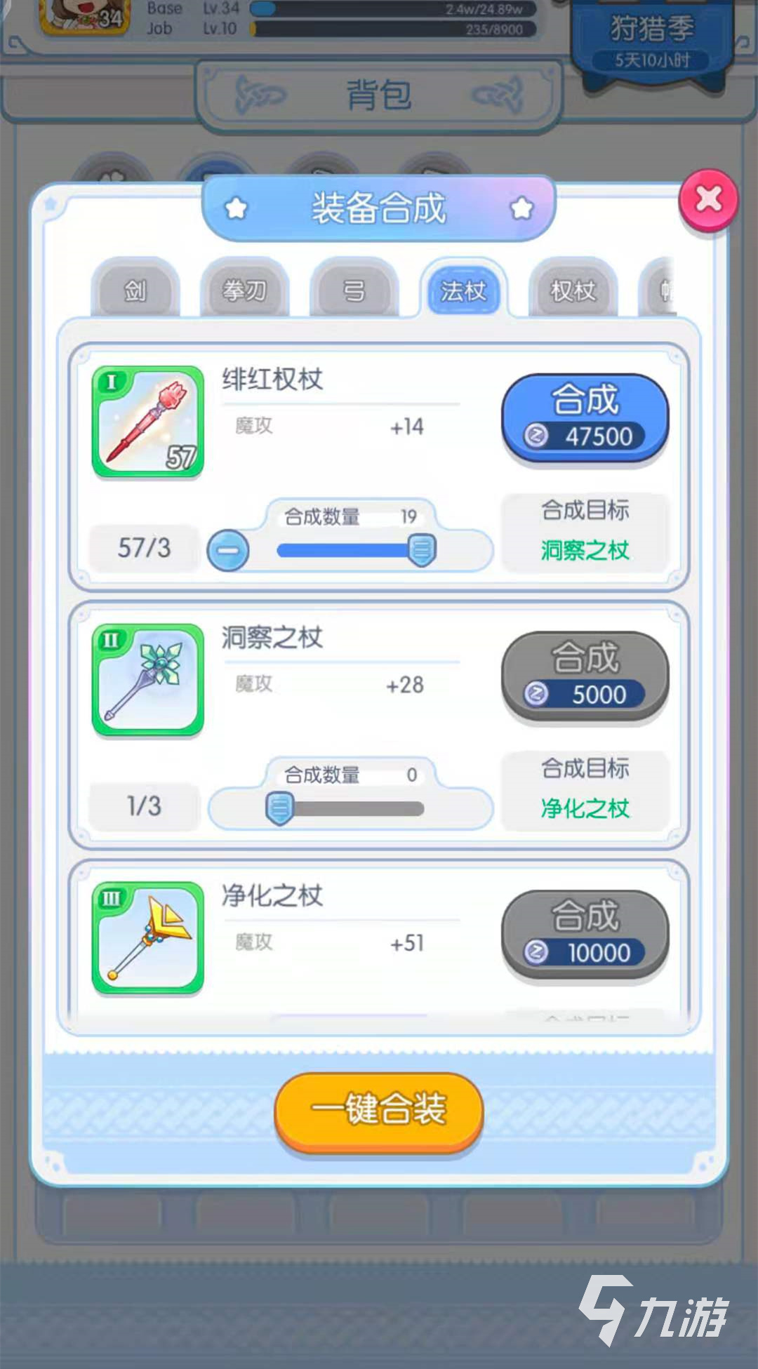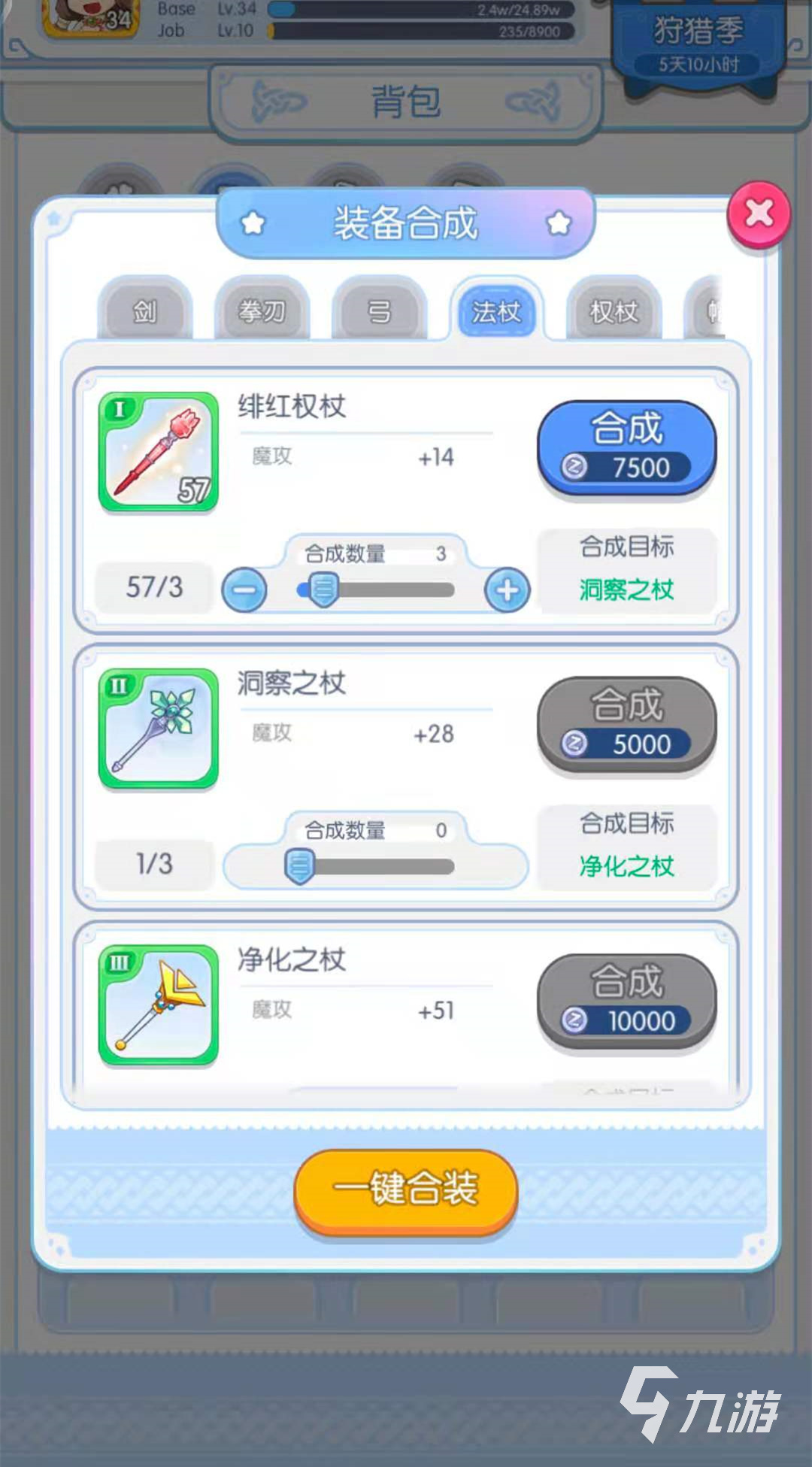 第二種合成方法是一鍵合裝,一鍵合裝的意思就是將玩家擁有的所有的緋紅權(quán)杖進(jìn)行合成,合成之后直接變成能合成的最終成果,需要看玩家緋紅權(quán)杖的數(shù)量了,就拿小編來說,小編擁有57個(gè)緋紅權(quán)杖,那么小編一鍵合裝之后就會合成兩個(gè)許愿之杖和一個(gè)洞察之杖,所以玩家需要哪種方法就選擇哪種方法進(jìn)行合成就可以了。
