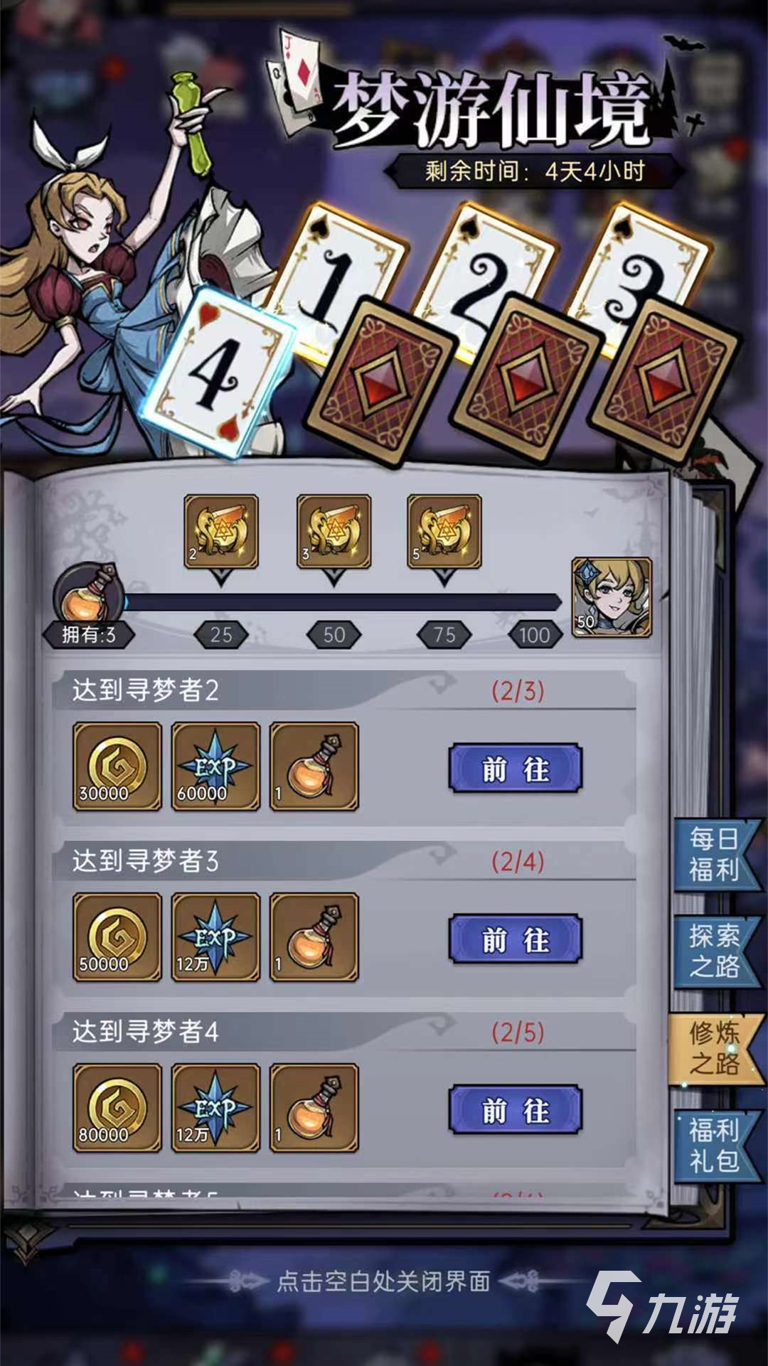第二個玩法是要求玩家的角色戰(zhàn)力值達到40萬,這個對于新手玩家來說暫時有一定的難度,慢慢積累吧,多多挑戰(zhàn)冒險任務(wù)的關(guān)卡,多升級技能就能給玩家的戰(zhàn)力值帶來提升,第三個玩法就最簡單了,要求玩家每日登陸1次就可以領(lǐng)取少量的鉆石,經(jīng)驗等等,玩家們再來看一下修煉之路里面的內(nèi)容,要求玩家達到尋夢者2,達到尋夢者3,達到尋夢者4,以此類推一直到最高級別,在此種玩法里會得到30000的金幣,60000的經(jīng)驗值以及升級道具,越往高給的金幣,經(jīng)驗值,道具都會越來越高。
