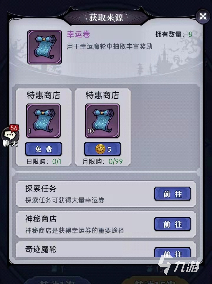 從屬性上看幸運卷屬于游戲內(nèi)紫色品質(zhì)道具,是一個比較珍貴的存在,目前游戲內(nèi)獲取幸運卷的方法一共有三種,第一種是通過商店里購買,玩家可在特惠商店以及神秘商店里購買到幸運卷,特惠商店使用的是特惠積分,特惠積分可以通過充值禮包獲取,而神秘商店則是需要用到金幣和鉆石,只不過神秘商店里面的商品并不是固定的,玩家可以多刷新幾次進行購買。