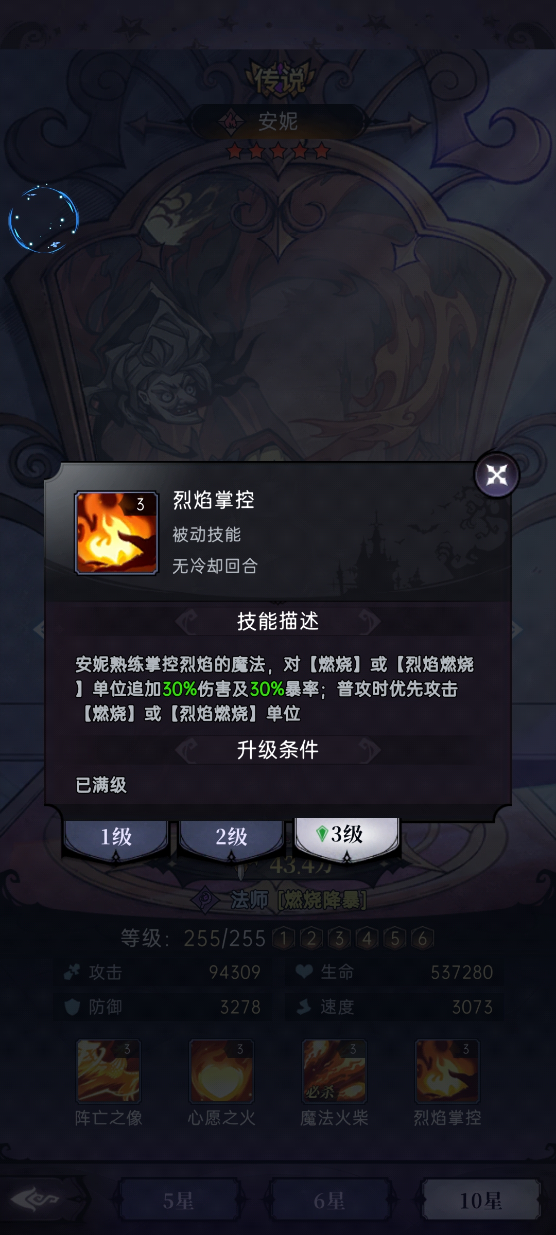 安妮:燃燒降暴法師,傳說品質(zhì)伙伴。一技能:對敵人前排造成法傷,并且有幾率附帶燃燒效果(每回合損失一定生命);二技能:提高一定的攻擊和生命值;三技能:隨即對三個敵人造成法傷,并且降低對方的暴擊幾率;四技能:安妮對有負面效果的敵人追加傷害,普攻優(yōu)先攻擊有負面效果的敵人。