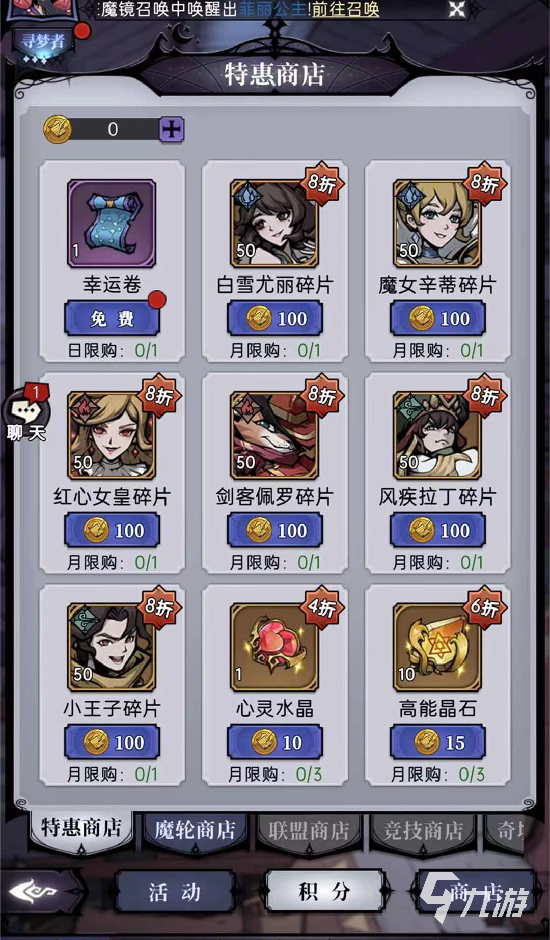 劍客佩蘭的獲取方式稍微有一點(diǎn)點(diǎn)難度了,玩家需要在魔晶召喚中進(jìn)行抽取,里面分別有兩個(gè)按鈕,一個(gè)是單次,另一次是十連召喚,每次登陸時(shí)會有一次免費(fèi)的召喚可供玩家使用,要想再多的話,就要消費(fèi)鉆石來購買,第二種方式可在特惠商店里面購買,需要用100個(gè)積分幣來獲取50個(gè)劍客佩羅碎片,目前有8折優(yōu)惠,心動的玩家可以在這個(gè)時(shí)期購買最合適了,還有很多種方法可以獲取到劍客佩羅,小編就不一一介紹給玩家了,玩家可自行學(xué)習(xí)。