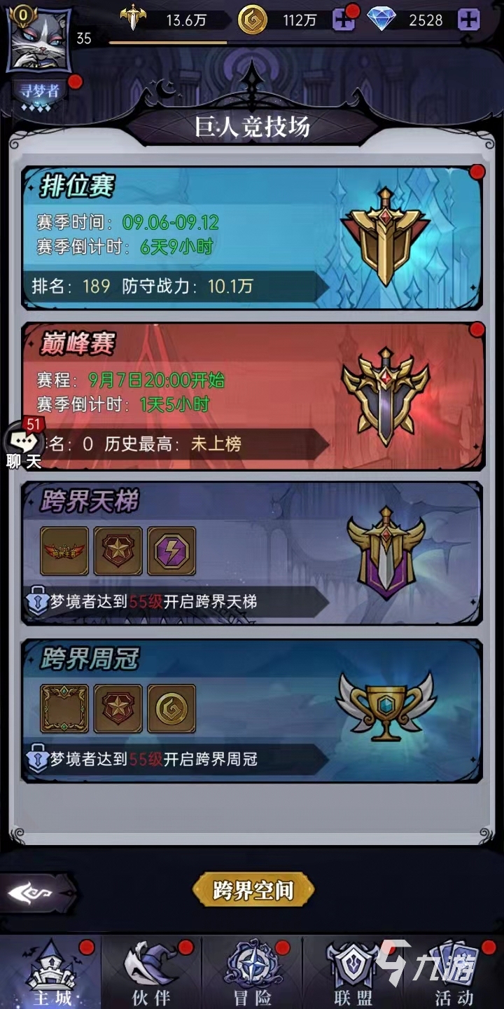 玩家通關(guān)特定的主線劇情之后,在游戲的主城界面會解鎖一個巨人競技場,巨人競技場里面一共會有四種玩法存在,分別是排位賽,巔峰賽,跨界天梯以及跨界周冠,其中排位賽以及巔峰賽是解鎖即可開放的,玩家可立即參與其中,而跨界天梯以及跨界周冠則是需要玩家等級達到55級才能開啟。