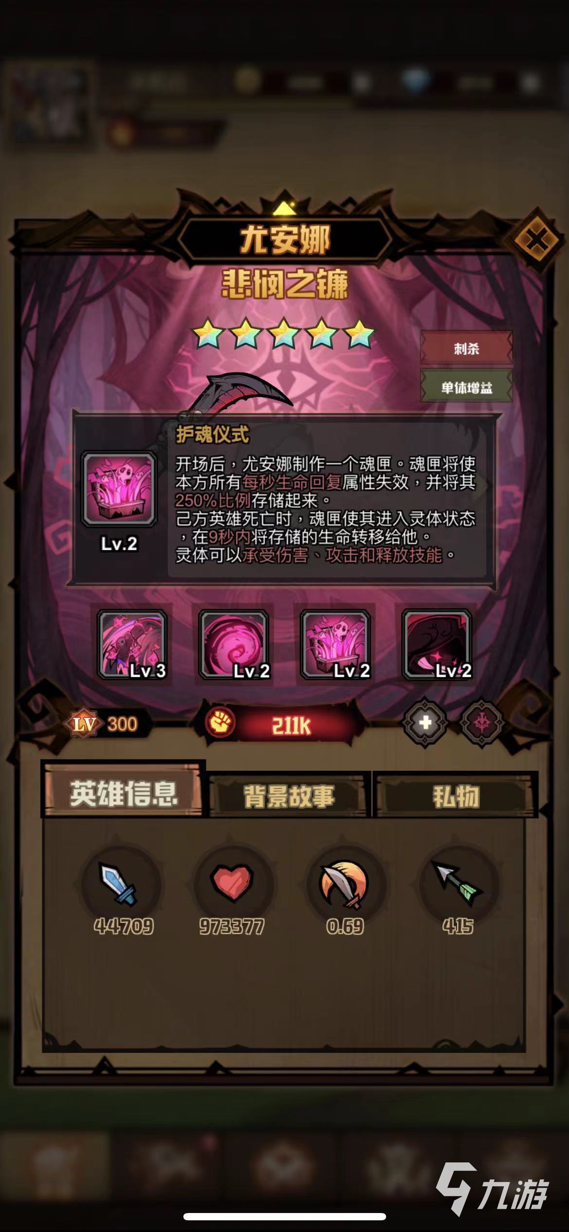 尤安娜是傳說級英雄,五星悲憫之鐮,她主刺殺攻擊,同時又可以給自身進(jìn)行單體增益,擁有四個技能,其一技能滌罪之鐮,在己方每次受到普通或直接技能攻擊時,尤安娜都會銘記在心,能量滿后她將對攻擊命中最多的敵人,進(jìn)行100%受擊次數(shù)、每次29%攻擊力的還擊,并重置計數(shù)。每次傷害她自身的攻擊將被計數(shù)3次,如果滌罪之鐮擊殺敵人,則重新制造魂匣,至多1次。