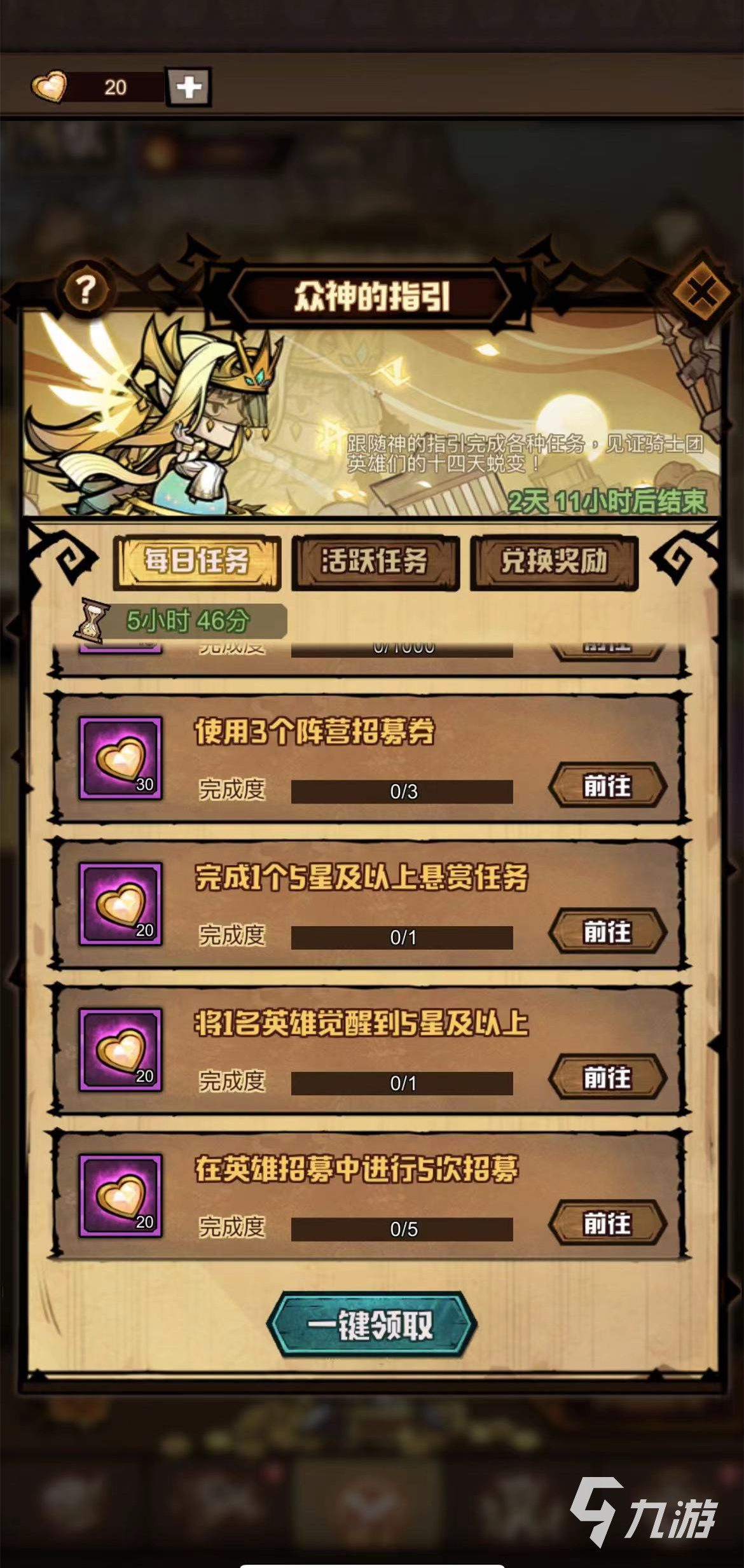 玩家需要通過活動(dòng)中的每日任務(wù)和活躍任務(wù)來獲得活動(dòng)貨幣,獎(jiǎng)勵(lì)兌換是屬于消耗活動(dòng)貨幣獎(jiǎng)勵(lì)噠,當(dāng)活動(dòng)結(jié)束以后,活動(dòng)貨幣就會(huì)被清空,這時(shí)就需要玩家多觀察動(dòng)態(tài),請(qǐng)及時(shí)兌換獎(jiǎng)勵(lì),在活躍任務(wù)中一共有6個(gè)小任務(wù),要求玩家使用20張普通懸賞令可以獲得少量的時(shí)光幣,當(dāng)然了玩家如果覺得這么一個(gè)個(gè)領(lǐng)取太麻煩的話,玩家還可以選擇一鍵領(lǐng)取,切記,環(huán)游世界的冒險(xiǎn)是有時(shí)間限制的,想要獲取的玩家抓緊時(shí)間。