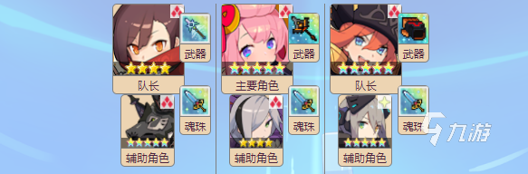 在新手階段真正組隊的時候,往往會出現(xiàn)不足以湊出一整隊單一屬性的情況,這時候沒有關系,一些比較強力的輔助性角色可以直接塞進隊伍,因為輔助性角色往往給主力提供增加傷害的buff,抑或是削弱敵方防御,自身輸出并不算很高,沒有1.5倍的傷害加成不會有太大影響。比如下圖,在主力輸出是光屬性的情況下配上了火系的輔助角色。