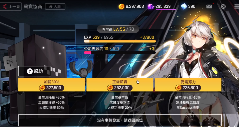 第二種是正常薪資,這個選擇的話相當(dāng)于一個中立選擇,花費的技金幣會提升一些,同時員工的忠誠度也可以獲得一定數(shù)值的提升,同時大成功率也會出現(xiàn)。這個大成功率就是獲得的提升為雙倍,不管是忠誠度還是等級經(jīng)驗的獎勵。
