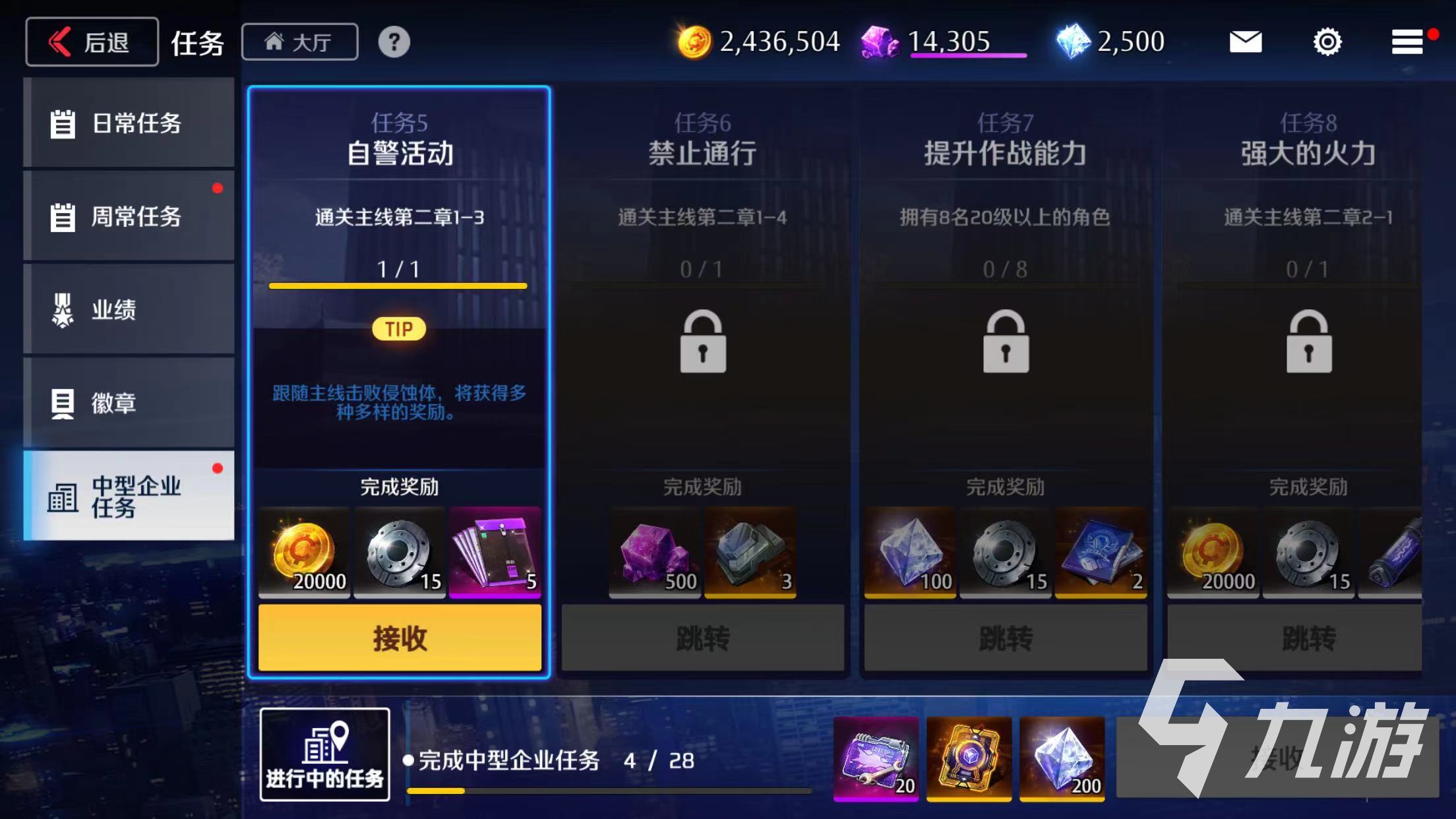 玩家進(jìn)入游戲后,可以在主頁面中看到多種不同故事,在故事中包括多個(gè)章節(jié),在章節(jié)中包含多種關(guān)卡,在第二章中的第三關(guān)卡自警活動(dòng),通過完成此關(guān)卡任務(wù)可以獲得金幣,艦船材料和特別能力鑒定書等道具獎(jiǎng)勵(lì)。