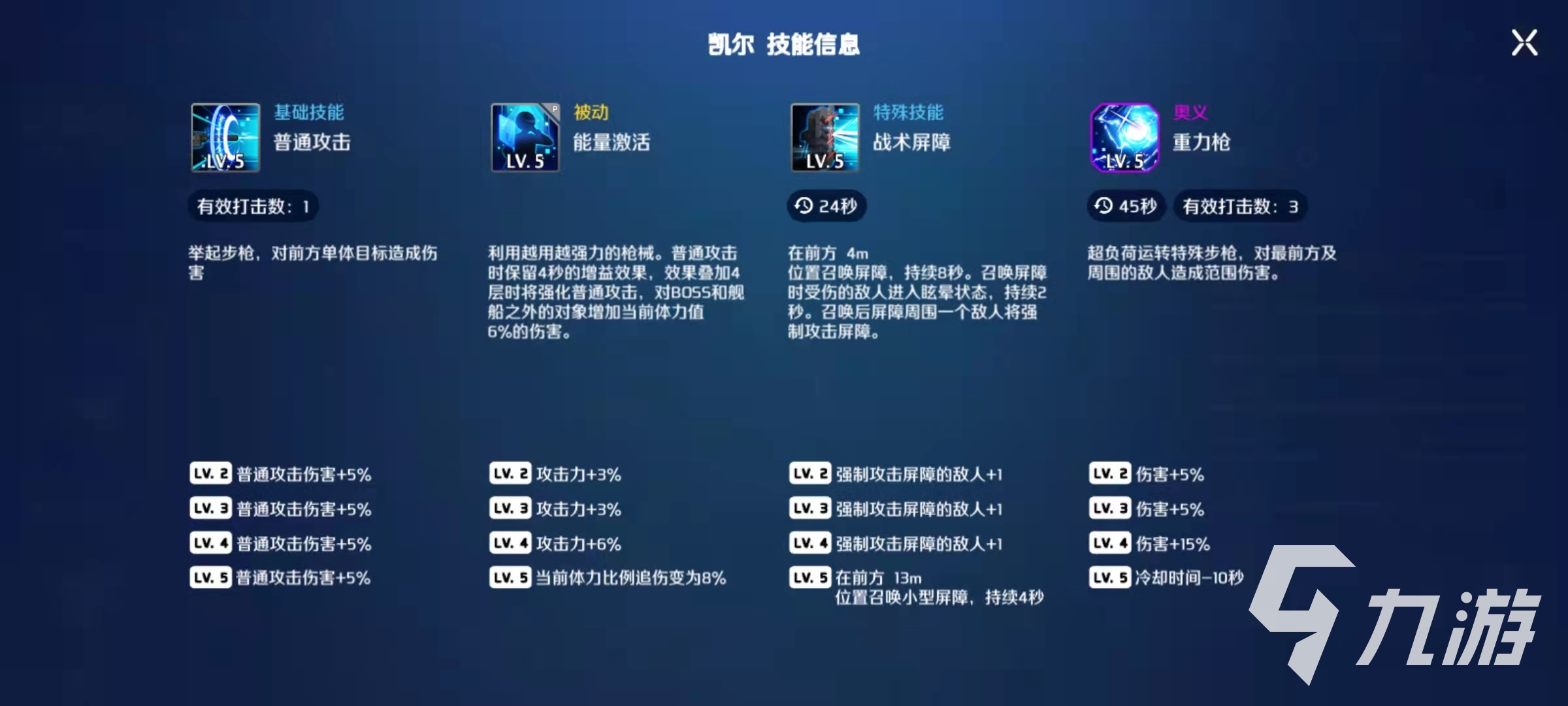 奧義技能是重力槍,可以使用自己的特殊步槍,對敵方最靠前的敵人造成高額范圍傷害。雖然冷卻時間長一些,但是在效果是非常好。從凱爾的技能就可以看出,雖然凱爾并不都是直接攻擊的技能,但是總體對于戰(zhàn)斗的影響還是很好的,屬于團隊型的員工。