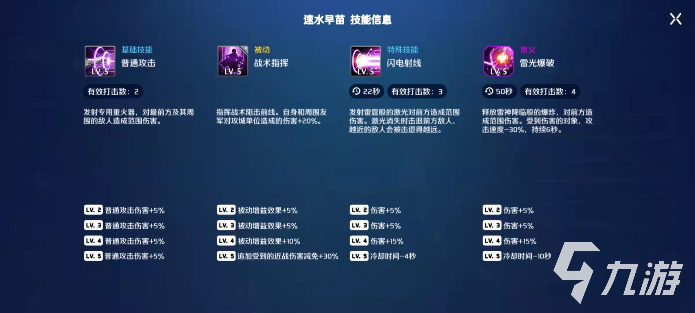 速水早苗的特殊技能閃電射線,能偶發(fā)射出激光來傷害前方的敵人,當(dāng)激光停止的時候,還可以造成擊退效果,距離敵人越近,擊退的距離也就越遠(yuǎn),可以有效地保護一下前排。奧義技能雷光爆破,可以對前方的敵人造成范圍傷害,并且傷害目標(biāo)的攻擊力還會降低百分之三十。