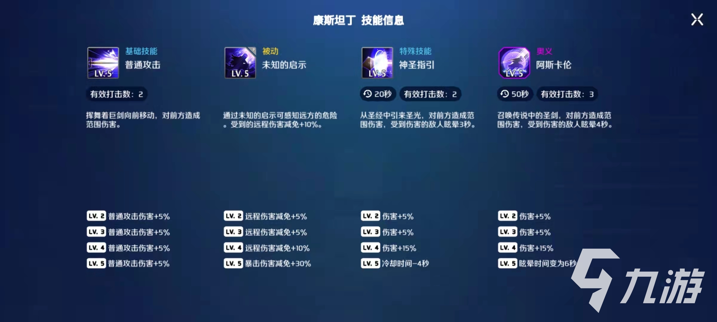 被動(dòng)技能的效果是可以降低受到的遠(yuǎn)程傷害,升星之后還能降低暴擊傷害等。特殊技能在使用之后可以對(duì)前方造成一次范圍傷害,被攻擊的敵人會(huì)被眩暈,這樣就既有傷害又有控制了。奧義技能的效果也是傷害加眩暈,但是眩暈的效果和傷害更好一些??傮w來說紫色的康斯坦丁就已經(jīng)能滿足絕大部分的需要了,尤其是需要控制的戰(zhàn)斗,康斯坦丁能貢獻(xiàn)長時(shí)間的眩暈。