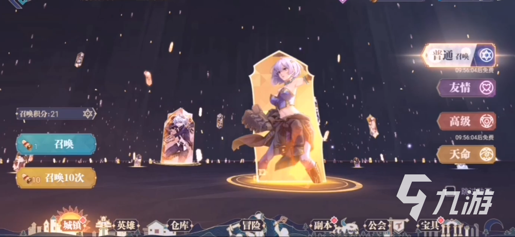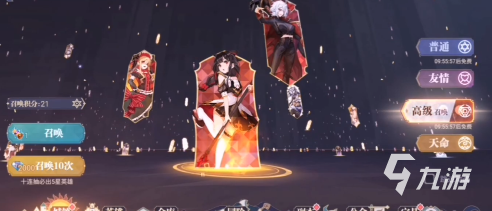 第三個就是高級召喚了,這個可以說是目前最為核心的一個召喚卡池??ǔ匦枰母呒壵賳揪磔S來開啟,或者說消耗兩千鉆石來進行十連抽。該卡池可以獲得三星到五星的英雄,有一定的保底機制,每日還有一次免費的機會。召喚技巧的話建議大家先單抽三次,三次出了四星英雄就進行十連抽,沒有出就等一會在反復的操作。還有就是該卡池積分和普通卡池積分是通用的。