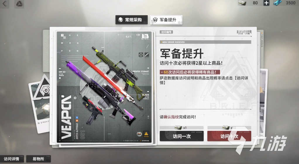 購置這個(gè)玩法就是游戲中的抽卡模式,每次抽卡的話會(huì)消耗訪問許可這個(gè)道具,單次消耗一張,訪問十次的話就是十張。該道具可以通過一些任務(wù)和玩法來獲得,如果說有足夠的坍塌結(jié)晶的話,也可以消耗該道具來進(jìn)行購買。在該玩法中是分為常規(guī)采購和軍備提升的,兩個(gè)購置玩法有一定的區(qū)別。