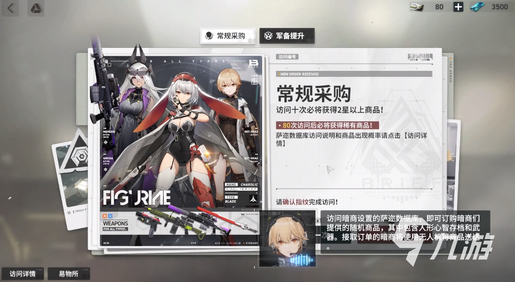 先來看一看常規(guī)采購,常規(guī)的采購簡單來說就是一個(gè)混合的卡池,前面也說了,游戲的人形和武器是很重要的。而在常規(guī)采購卡池中,采購的結(jié)果是會(huì)出現(xiàn)人形和武器獎(jiǎng)勵(lì)的,這個(gè)獎(jiǎng)勵(lì)的結(jié)果是隨機(jī)的,能否獲得稀有人形和武器就看運(yùn)氣了。不過也不用擔(dān)心,這個(gè)采購的話也是有保底機(jī)制的, 玩家只要進(jìn)行八十次的訪問,那么就可以穩(wěn)定獲得稀有級別的商品獎(jiǎng)勵(lì)。如果在中途出稀有的話,那么次數(shù)就會(huì)重置。