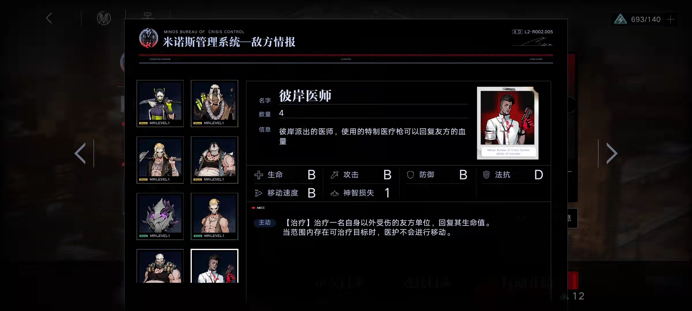 彼岸醫(yī)師,和幫派打手·精英一樣,數(shù)值較為平衡,在單兵作戰(zhàn)的時候他并不是什么難纏的敵人,只不過他的主動技能治療可以恢復(fù)攻擊范圍內(nèi)友方單位的生命值,而且在治療的時候他就會停下腳步不再移動,這也就意味著他很可能會成為敵方的固定泉水,要及時的將他處理掉,不然一直放任他恢復(fù)生命值會浪費(fèi)我方禁閉者的輸出。