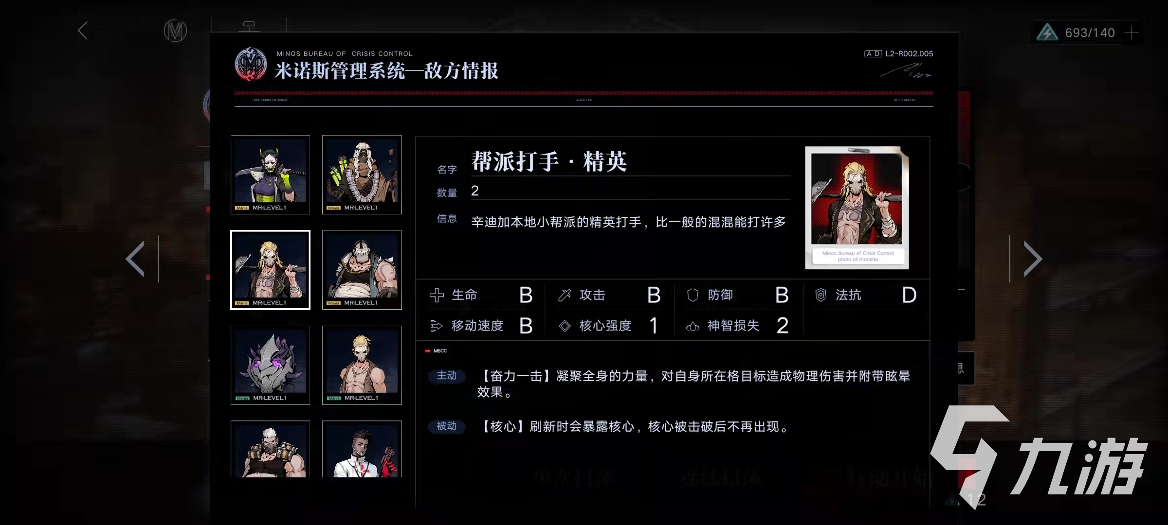 幫派打手·精英,是一個數(shù)值較為平衡,沒有什么明顯劣勢,屬于中等難度的敵人,這個敵人擁有一個核心強(qiáng)度,他有兩個技能,一個技能是奮力一擊,可以對自身所在格子的我方禁閉者造成附帶眩暈的范圍傷害,這個技能可以用破核技能打斷,被動效果是核心,幫派打手刷新的時候自身的核心會暴露出來,因此要攜帶有破核能力的禁閉者,幫派打手·精英的核心被破壞后被動技能核心就不再觸發(fā)了。