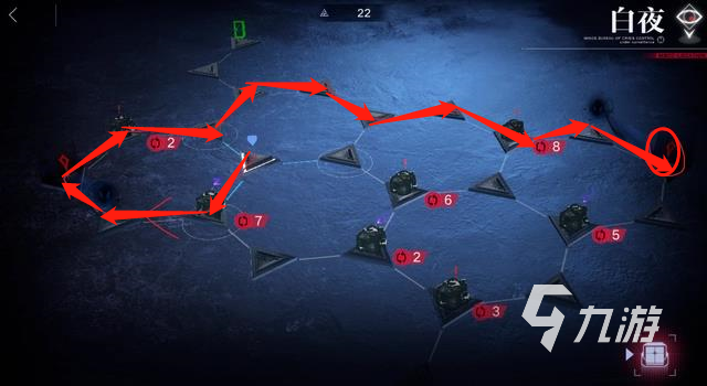 2、第二步:之后需要返回一段路程,接著沿著標(biāo)出的紅箭頭朝著左下方前進(jìn),達(dá)到標(biāo)記的雙箭頭位置。這個(gè)時(shí)候還有22行動(dòng)值。