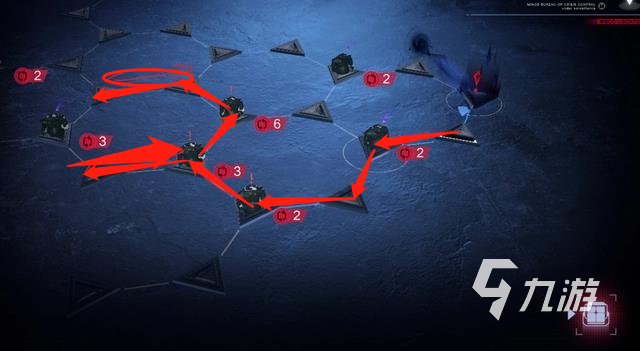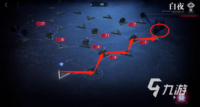 1、第一步:首先從起點(diǎn)位置進(jìn)行出發(fā),沿著小編標(biāo)出的紅箭頭線條來到右上角的“紅圈處”,然后將黑影給解決掉,這個(gè)時(shí)候還有35行動(dòng)值。