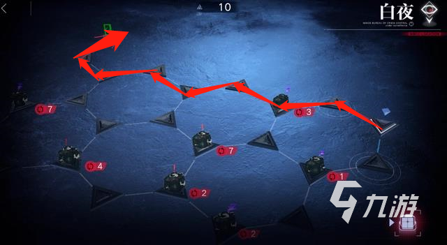 3、第三步:接著還是沿著小編標(biāo)出的紅箭頭處出發(fā),從起始位置一直走到右上角帶有“感嘆號(hào)”的地方,這個(gè)時(shí)候還有10行動(dòng)值。