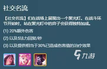 白學名流實際上是S6非常強勢的一個體系,有點類似之前的重秘體系,即一切羈絆都是圍繞陣容的主C來的。白學名流即白魔法師、學者和社會名流羈絆,白魔法師能夠增加全體隊員的魔法抗性,還能提升白魔法師英雄的治療和護盾強度,可以說輔助屬性直接拉滿。其次就是學者羈絆,增加全體回藍。而社會名流才是這套體系的重中之重,社會名流羈絆會在場上生成一個聚光燈,聚光燈下的英雄可以獲得傷害增益、回藍增益或者續(xù)航增益的屬性,所以在這三個羈絆上我們再找一個主C即可。