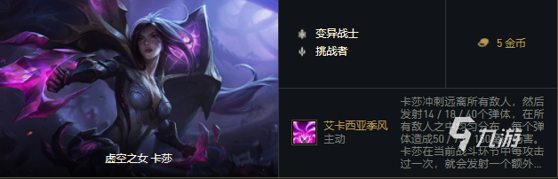 卡莎可以遠(yuǎn)離敵人,并對(duì)敵人發(fā)射多個(gè)彈體,并且平A次數(shù)可以增加卡莎的彈體數(shù)量。遠(yuǎn)離敵人保證了卡莎的生存能力,彈體的總傷害非常高,但是可惜是均勻分布的,這導(dǎo)致卡莎的爆發(fā)并沒(méi)有很高,算是一張中規(guī)中矩的五費(fèi)卡。