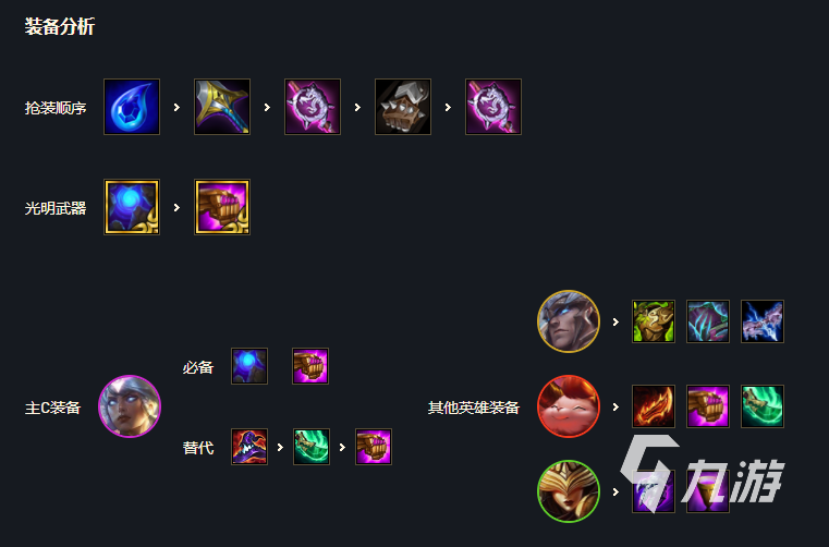 優(yōu)先卡爾瑪輸出裝備光明藍(lán),法爆無盡帽子,蓋倫肉裝鬼書狂徒離子,辛德拉伏擊圣杯保護(hù),其它輸出裝給提莫。