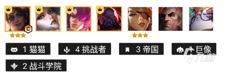 陣容羈絆:一貓貓四挑戰(zhàn)者三帝國(guó)一巨像兩戰(zhàn)斗學(xué)院。