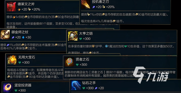 大亨之鎧:每次受到傷害可以提升1點魔抗護甲和10點生命值,可以疊加50次(疊滿時獎勵2金幣)