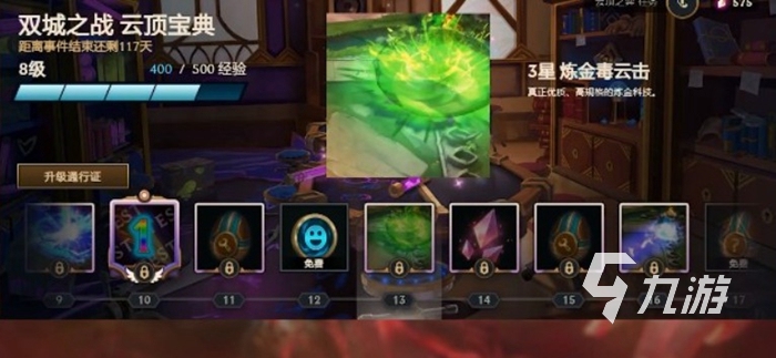 0級可以領(lǐng)取雙城之戰(zhàn)科技寶庫,也就是雙城之戰(zhàn)主題河靈以及1星版本的進攻特效。攻擊特效分為煉金毒云擊(5級領(lǐng)取2星、13級領(lǐng)取3星),閃電鏈(16級領(lǐng)取2星),??怂构鈿⑴冢?級領(lǐng)取1星、9級領(lǐng)取3星)以及導彈轟炸(21級領(lǐng)取2星)四種。