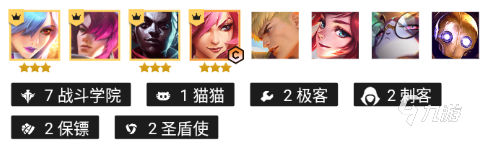 陣容羈絆:七戰(zhàn)斗學院一貓貓兩極客兩刺客兩保鏢兩圣盾使。