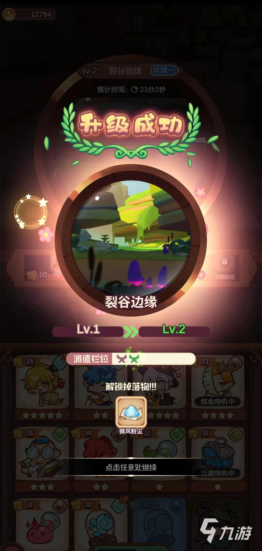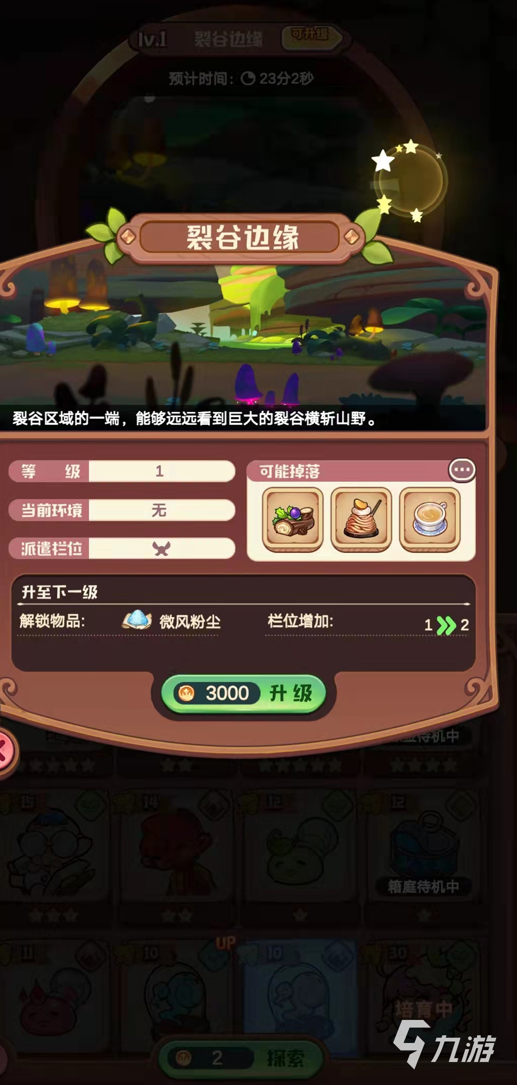 點(diǎn)擊綠色的三千金幣,玩家的裂谷邊緣區(qū)域就成功地升級(jí)到lv2,并且解鎖掉落物微風(fēng)粉塵,派遣欄位中的第二位置變綠了,就是可以使用的意思,裂谷邊緣還有可能掉落木枝蛋糕,栗子蛋糕,奶茶,熔巖蛋糕,植物幣,星隕結(jié)晶,壓縮餅干,甜味餅干,海苔餅干,果醬餅干,抹茶餅干,夾心餅干。
