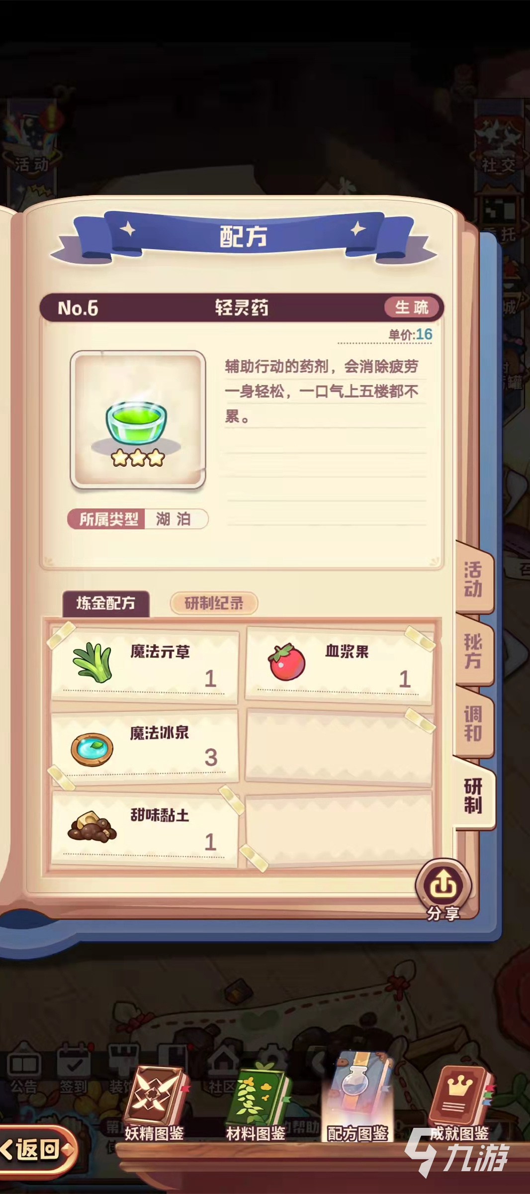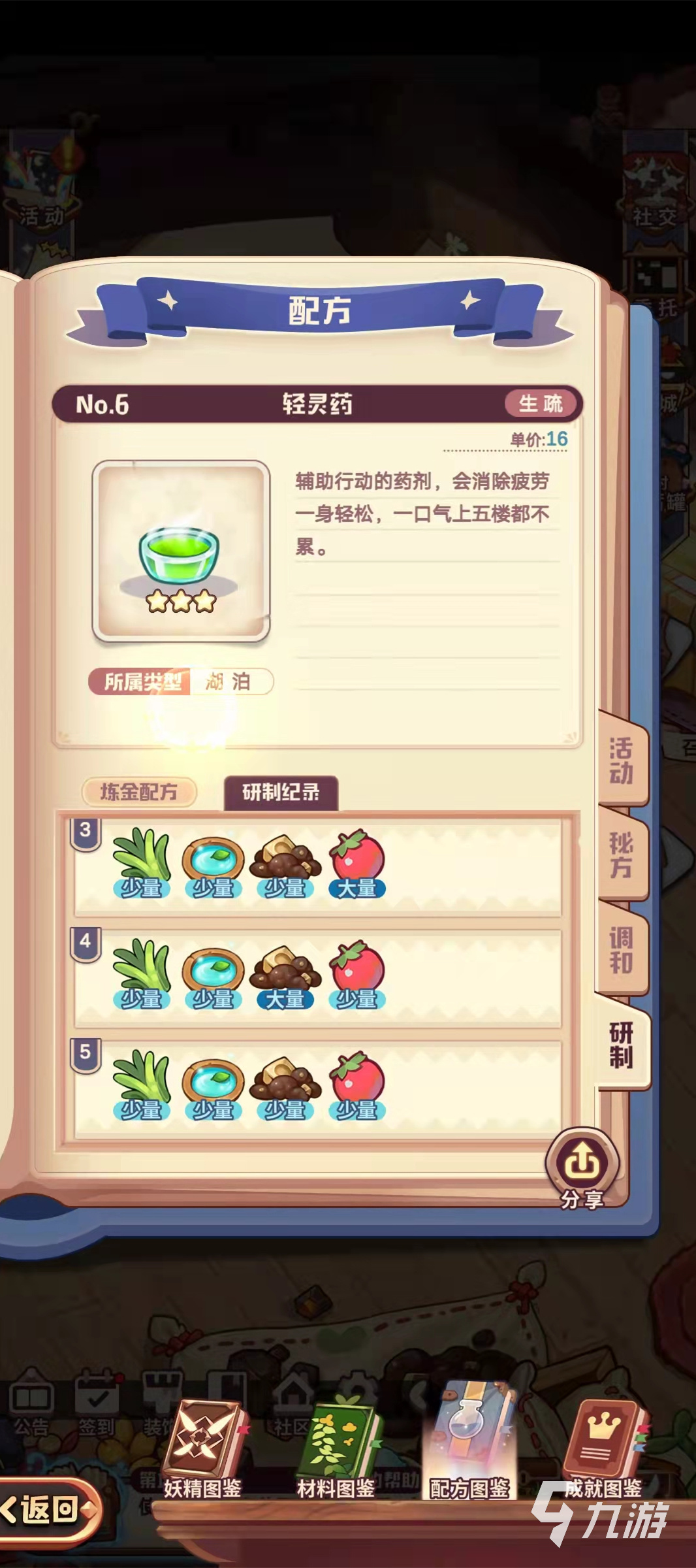 小編現(xiàn)在簡單的介紹一下輕靈藥,輕靈藥是一種輔助行動(dòng)的藥劑,不僅會(huì)消除疲勞一身輕松,而且一口氣連上五樓都不費(fèi)勁,輕靈藥的所屬類型是湖泊類里面的,售賣單價(jià)為16,小編第一次研制就研制出來的是三星的輕靈藥。