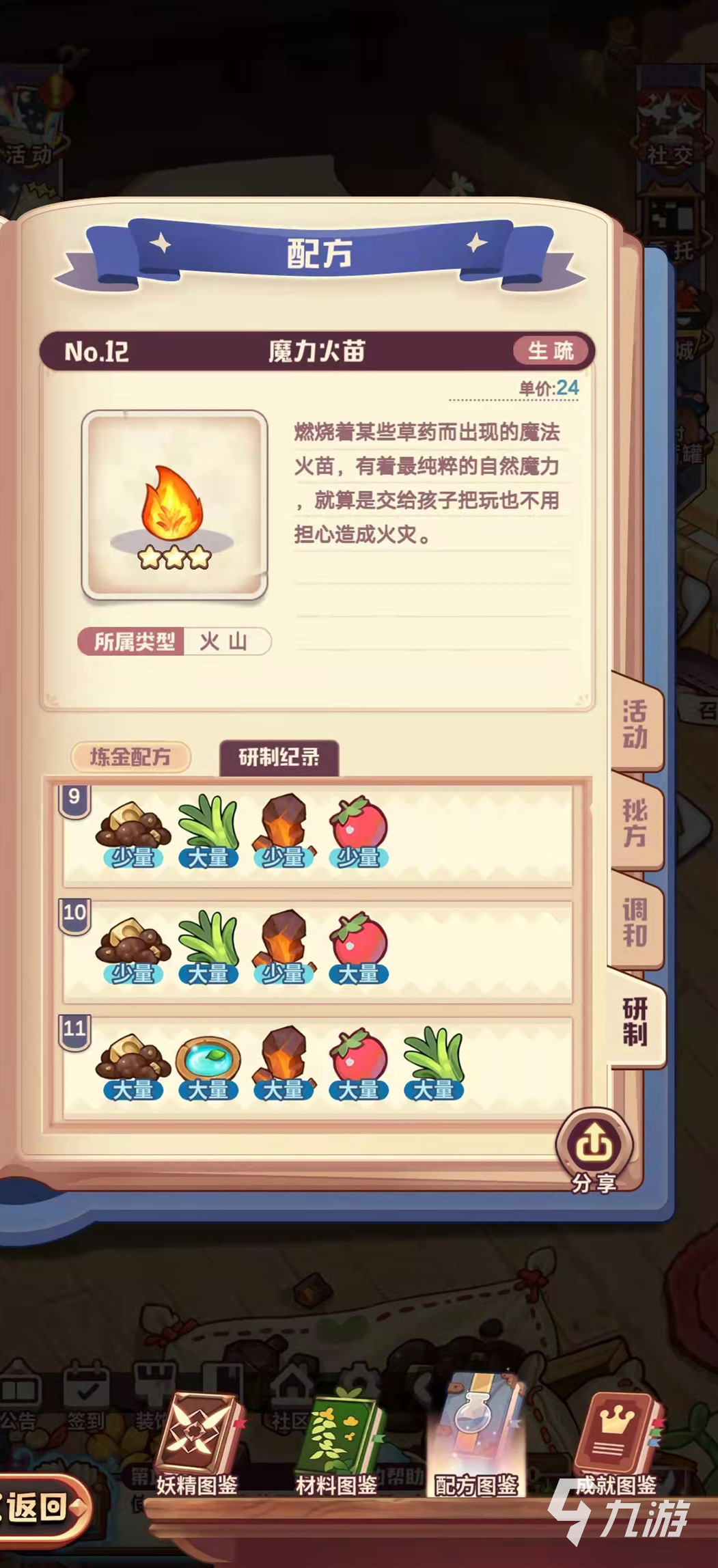 魔力火苗是燃燒著某些草藥而出現(xiàn)的魔法火苗,有著最純粹的自然魔力,就算是交給孩子把玩也不用擔(dān)心造成火災(zāi),可見魔力火苗的魅力,魔力火苗所屬類型是火山系列的一種,單價(jià)是24,煉金配方其實(shí)用甜味黏土,魔法元草,火晶石和血漿果就可以,但是小編在研究魔力火苗的研制配方時(shí)還偷偷加入過魔法冰泉。