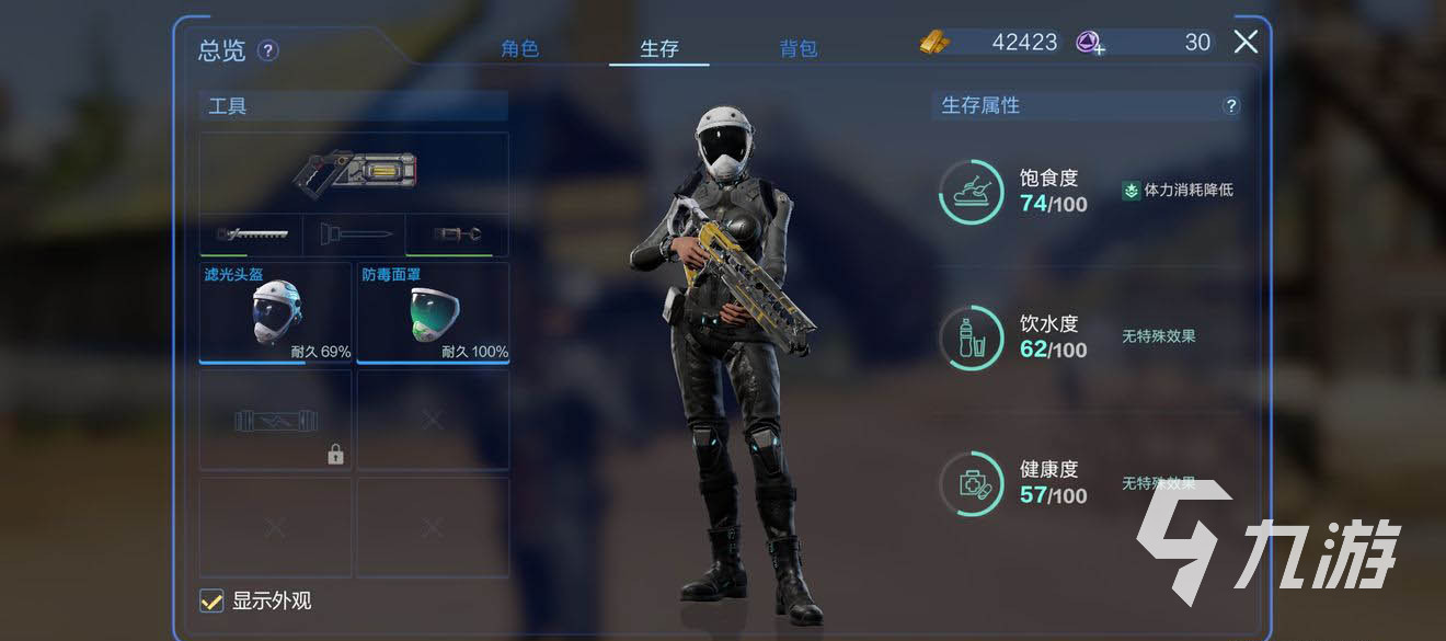 而在生存面板就能看到各種工具,這些工具有的可以采集,有的則主要是防護(hù)的作用,同時(shí)在此面板也能看到自己的生存屬性數(shù)值,提醒一下新手小伙伴們,這其中的健康值是直接關(guān)乎角色血條的,如果健康值過(guò)低的話,角色想要進(jìn)行一些跳躍動(dòng)作的話,也是做不了的哦。