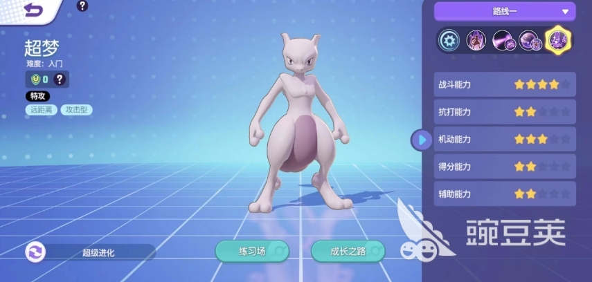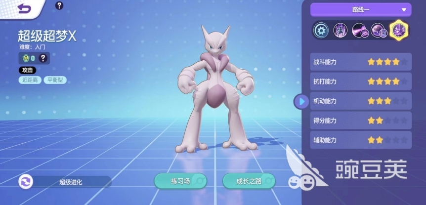 除卻Y形態(tài)外,另一個(gè)X形態(tài)的超夢(mèng)也非常不錯(cuò),它屬于近戰(zhàn)平衡型寶可夢(mèng),技能的效果與超夢(mèng)Y相同,不過射程要短一些,但相對(duì)的,它的屬性更全面,戰(zhàn)斗能力和抗打能力都有三星,超進(jìn)化后更是能達(dá)到雙四星的水準(zhǔn),在游戲中可謂是攻防一體的存在。