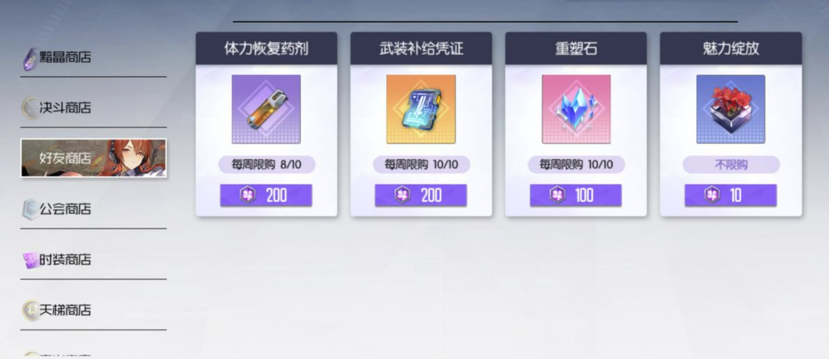 兌換-玩家是可以利用碎片去商店里邊進(jìn)行道具的一個(gè)兌換的,這里包括基礎(chǔ)商店跟商城這兩個(gè)地方,只要玩家拿出碎片都是可以進(jìn)行兌換的,雖然道具的種類不是那么的多,但是多少都是可以給角色帶來(lái)實(shí)力的提升,最好就是SR級(jí)別的武裝去進(jìn)行兌換,可以收獲不容小覷的獎(jiǎng)勵(lì)哦,SSR的話建議暫時(shí)保留看看后邊的其他活動(dòng)。