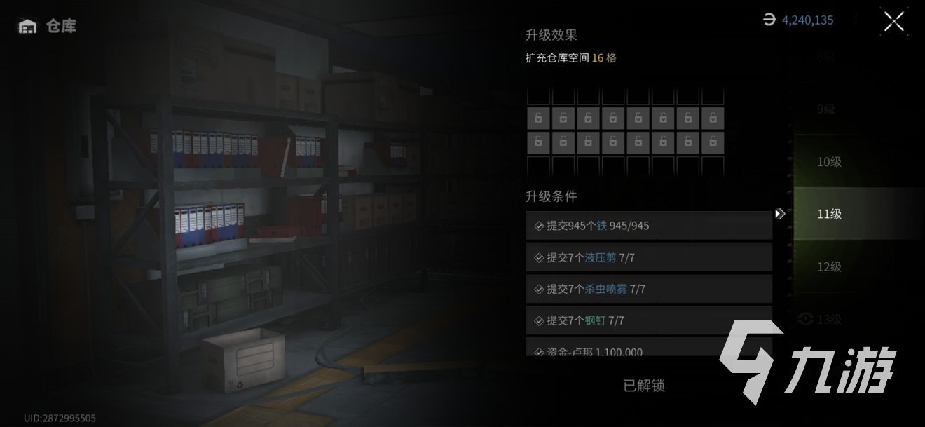 倉(cāng)庫(kù),可以從1級(jí)升到9級(jí),每一級(jí)所需要的資源以及資源的種類都是不斷提升的,1級(jí)只需要5個(gè)鐵,就可以獲得48格,而到了9級(jí)這里,這需要630鐵、5個(gè)螺釘、5個(gè)螺母、5個(gè)電動(dòng)螺絲刀,并且將安保等級(jí)提升到3級(jí)。