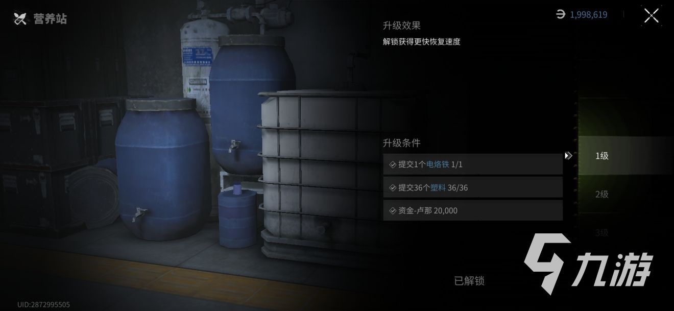 營(yíng)養(yǎng)站,有3級(jí),對(duì)應(yīng)電洛鐵1/2/3,塑料36/72/108,盧娜2萬(wàn)/5萬(wàn),其中2級(jí)和3級(jí)的營(yíng)養(yǎng)站需要安保達(dá)到對(duì)應(yīng)等級(jí)。