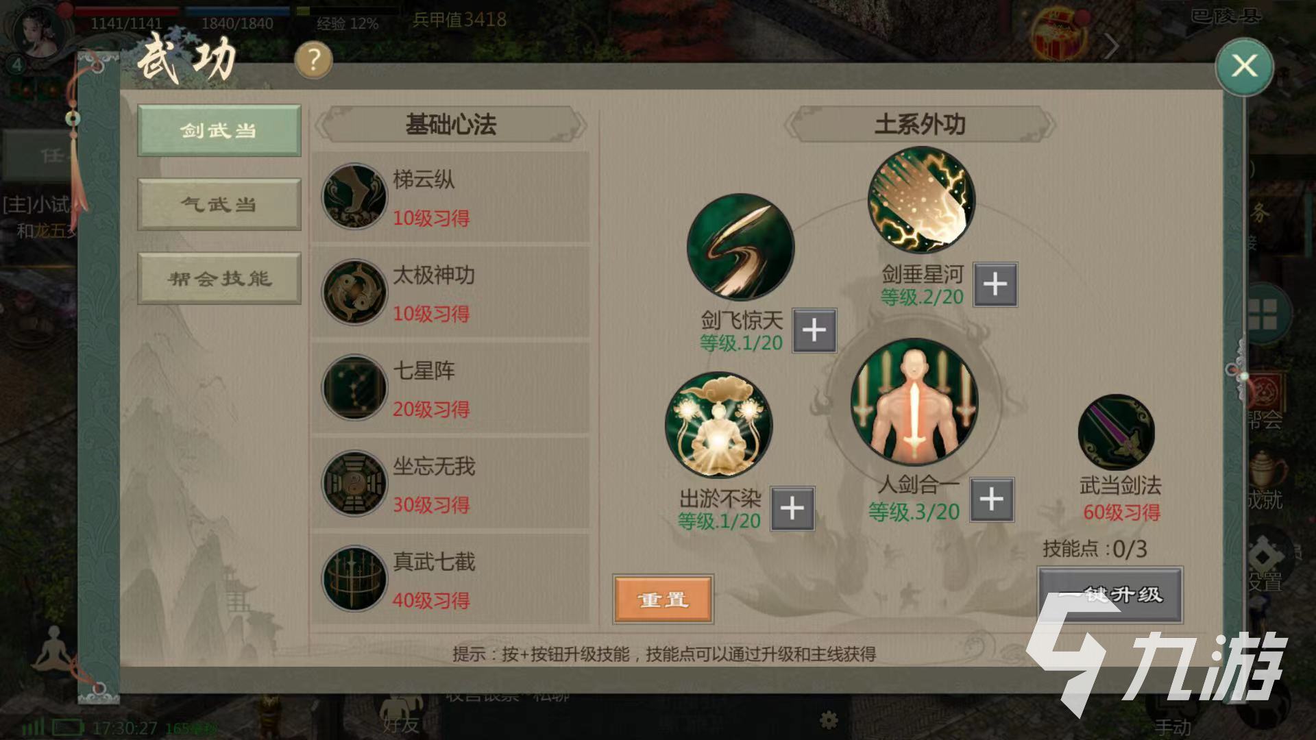 在武功中可以選擇劍武當,此流派屬于土系外功,其中包括劍垂星河,劍飛驚天,出淤不染和主要技能人劍合一。通過技能點進行一鍵升級的方式,可以提升各種不同的武功等級。隨著武功不斷提升后,可以增強玩家挑戰(zhàn)力。