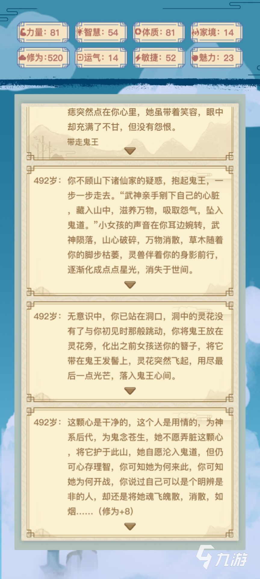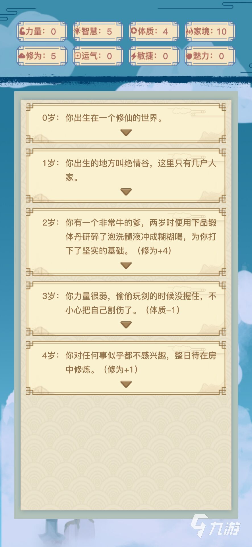 家境:這款游戲目前看來消耗家境的地方有點多,因為家境和修為有著很明顯的聯(lián)系,所以游戲開局最好的屬性劃分就是8-10點家境,其他的均勻分配給另外三項,每局屬性加點如果低于3點的話很有可能開局就沒,所以盡量開局不要太極端。
