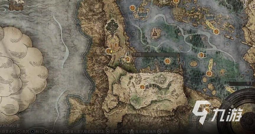 首先我們根據(jù)地圖的提示來到改宗塔的位置,這個(gè)位置呢位于我們的湖的最左側(cè),這邊會(huì)有一個(gè)小黃金樹的標(biāo)識(shí),下面就有一個(gè)塔。在這個(gè)塔和黃金樹的中間,就是我們要找的墓地所在了,嗯。這邊我們直接從塔是過不去的,我們需要從這里繞我整個(gè)黃金樹。要轉(zhuǎn)一個(gè)圈才能到達(dá)這個(gè)位置。